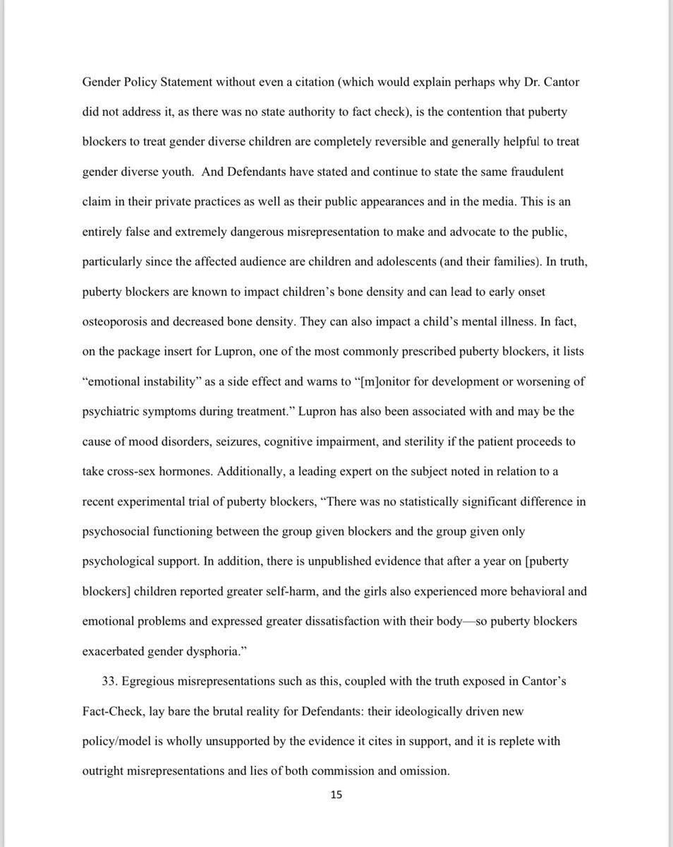 A particularly egregious misrepresentation, which is repeated multiple times in the Gender Policy Statement without even a citation is the contention that puberty blockers to treat gender diverse children are completely reversible and generally helpful to treat gender diverse youth. And Defendants have stated and continue to state the same fraudulent claim in their private practices as well as their public appearances and in the media. This is an entirely false and extremely dangerous misrepresentation to make and advocate to the public, particularly since the affected audience are children and adolescents (and their families). In truth, puberty blockers are known to impact children's bone density and can lead to early onset osteoporosis and decreased bone density. They can also impact a child's mental illness. In fact, on the package insert for Lupron, one of the most commonly prescribed puberty blockers, it lists ‘emotional instability’ as a side effect and warns to "[m]onitor for development or worsening of psychiatric symptoms during treatment." Lupron has also been associated with and may be the cause of mood disorders, seizures, cognitive impairment, and sterility if the patient proceeds to take cross-sex hormones. Additionally, a leading expert on the subject noted in relation to a recent experimental trial of puberty blockers, "There was no statistically significant difference in psychosocial functioning between the group given blockers and the group given only psychological support. In addition, there is unpublished evidence that after a year on [puberty blockers] children reported greater self-harm, and the girls also experienced more behavioral and emotional problems and expressed greater dissatisfaction with their body so puberty blockers exacerbated gender dysphoria."