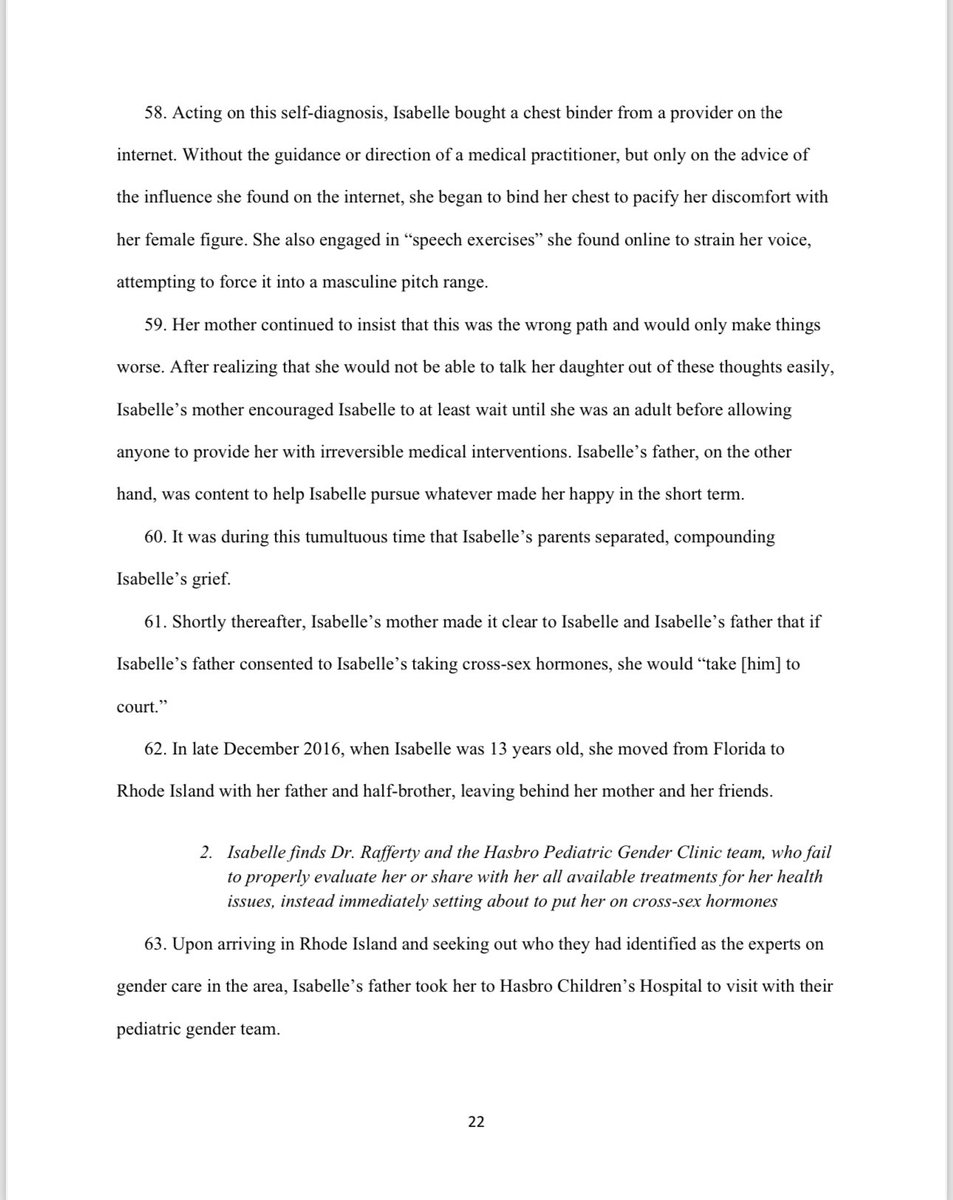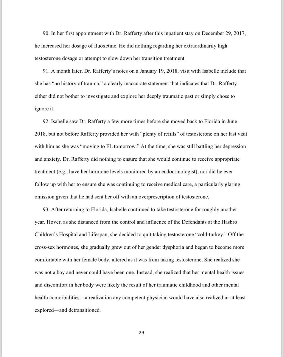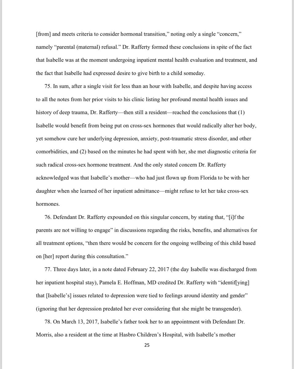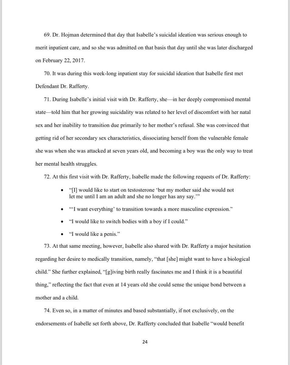 During Isabelle's initial visit with Dr. Rafferty, she in her deeply compromised mental state told him that her growing suicidality was related to her level of discomfort with her natal sex and her inability to transition due primarily to her mother's refusal. She was convinced that getting rid of her secondary sex characteristics, dissociating herself from the vulnerable female she was when she was attacked at seven years old, and becoming a boy was the only way to treat her mental health struggles. At this first visit with Dr. Rafferty, Isabelle made the following requests of Dr. Rafferty: ▪️“I would like to start on testosterone but my mother said she would not let me until I am an adult and she no longer has any say." ▪️“I want everything to transition towards a more masculine expression." ▪️“I would like to switch bodies with a boy if I could." ▪️“I would like a penis.” At that same meeting, however, Isabelle also shared with Dr. Rafferty a major hesitation regarding her desire to medically transition, namely, "that [she] might want to have a biological child." She further explained, "giving birth really fascinates me and I think it is a beautiful thing," reflecting the fact that even at 14 years old she could sense the unique bond between a mother and a child. Even so, in a matter of minutes and based substantially, if not exclusively, on the endorsements of Isabelle set forth above, Dr. Rafferty concluded that Isabelle "would benefit [from] and meets criteria to consider hormonal transition," noting only a single "concern," namely "parental (maternal) refusal." Dr. Rafferty formed these conclusions in spite of the fact that Isabelle was at the moment undergoing inpatient mental health evaluation and treatment, and the fact that Isabelle had expressed desire to give birth to a child someday.