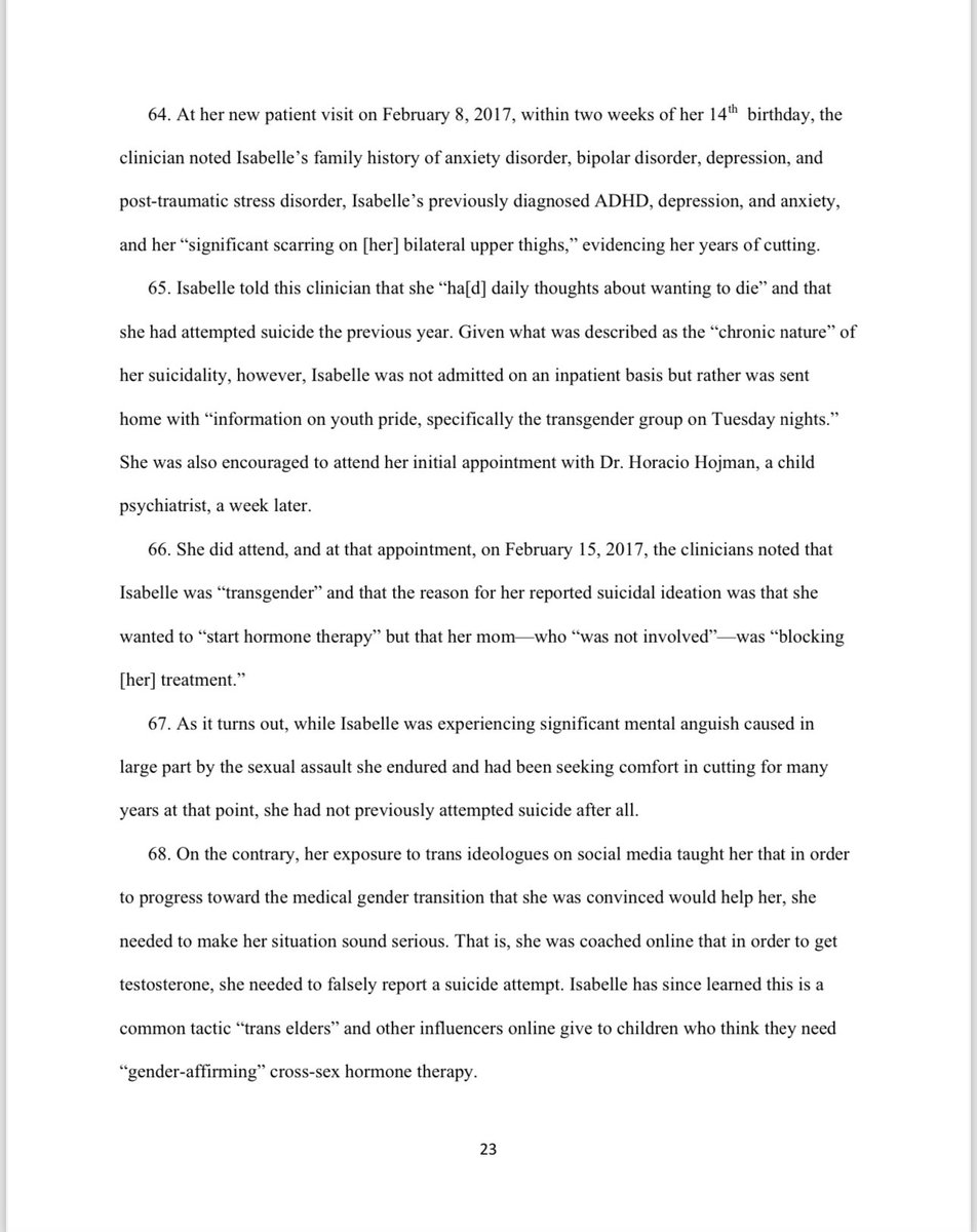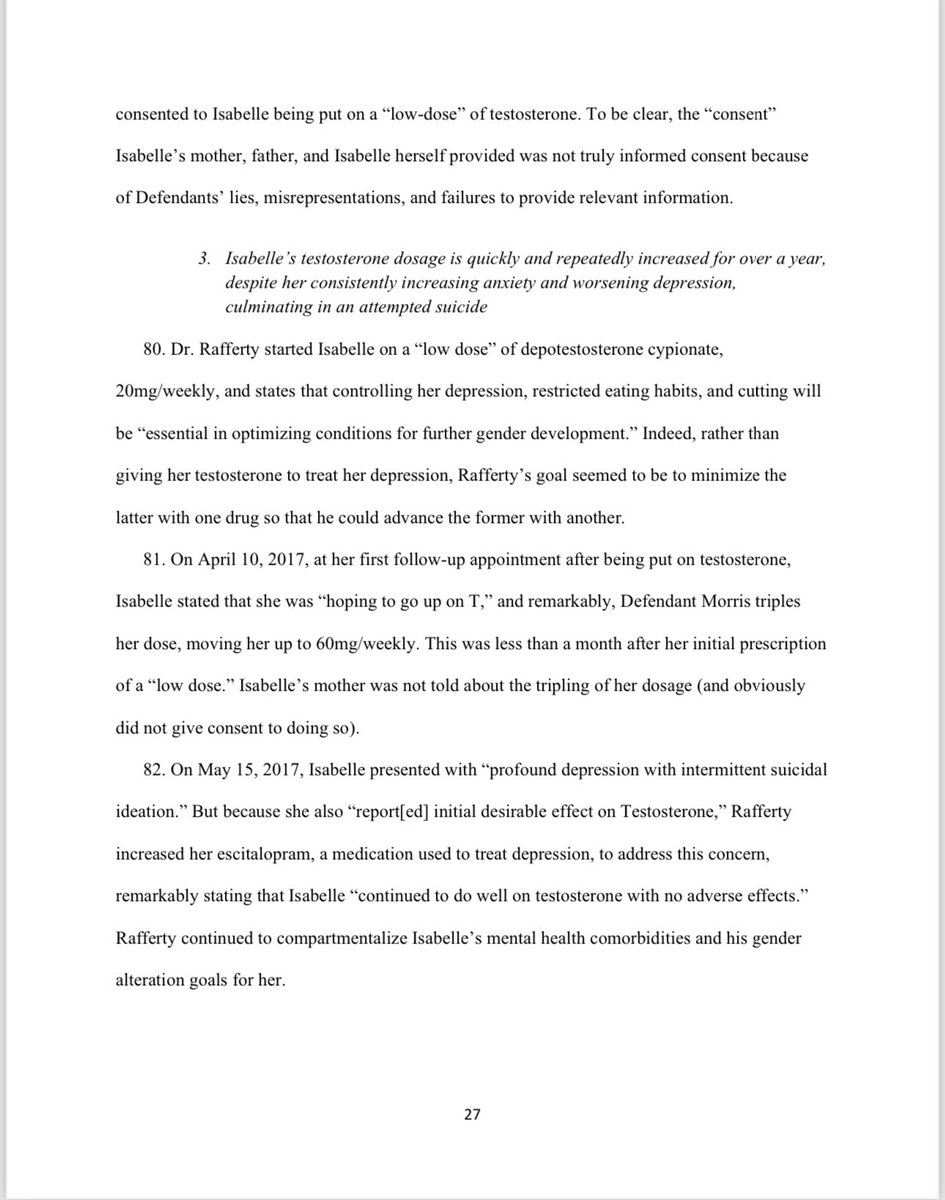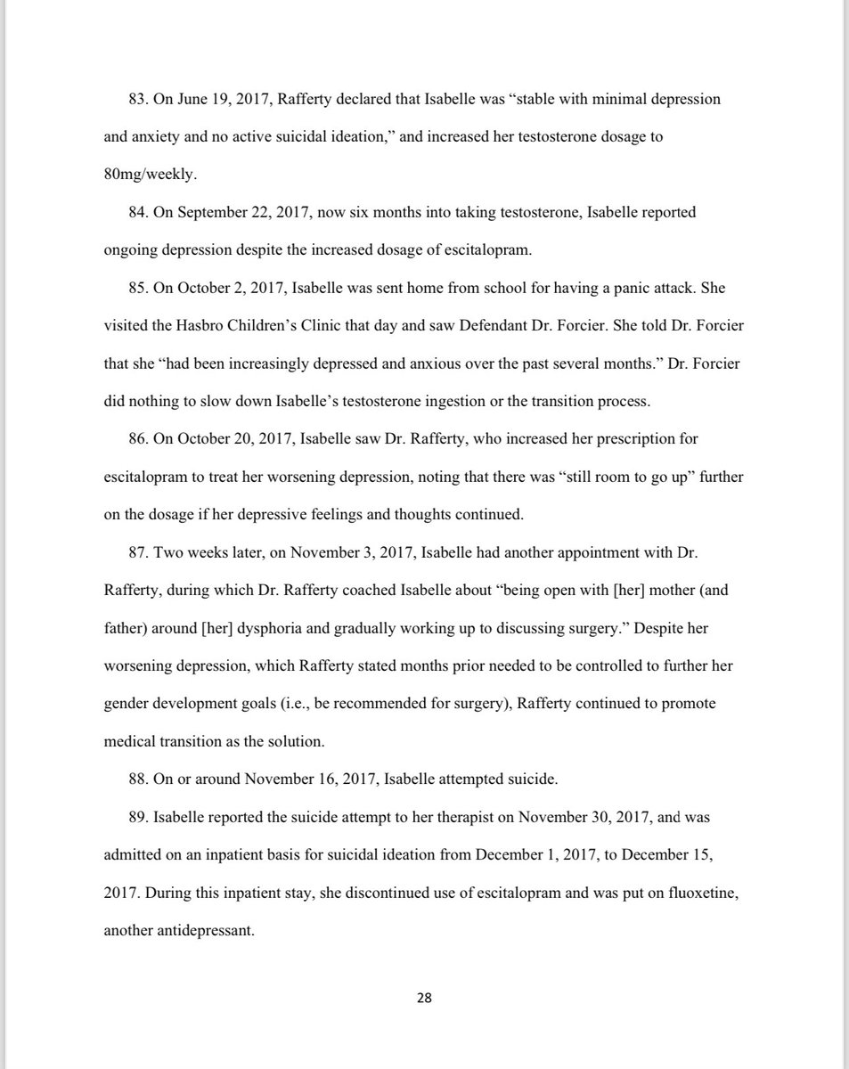 Shortly after starting on testosterone, Isabelle reported "profound depression with intermittent suicidal ideation." Dr. Jason Rafferty increased her dose! 6 months in, she reported ongoing depression. She then saw Dr. Michelle Forcier (the “Do chickens cry?” lady from “What is a Woman?”) Isabelle told Dr. Forcier how her anxiety and depression had been worsening, but Forcier did nothing to slow down Isabelle’s testosterone use. The next month, Isabelle attempted suicide.
