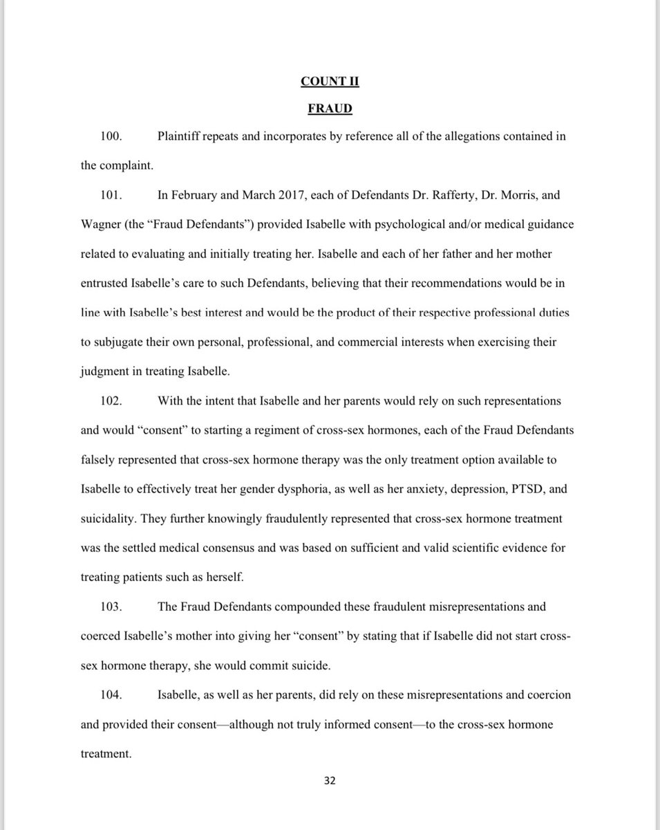 With the intent that Isabelle and her parents would rely on such representations and would "consent" to starting a regiment of cross-sex hormones, each of the Fraud Defendants falsely represented that cross-sex hormone therapy was the only treatment option available to Isabelle to effectively treat her gender dysphoria, as well as her anxiety, depression, PTSD, and suicidality. They further knowingly fraudulently represented that cross-sex hormone treatment was the settled medical consensus and was based on sufficient and valid scientific evidence for treating patients such as herself. The Fraud Defendants compounded these fraudulent misrepresentations and coerced Isabelle's mother into giving her "consent" by stating that if Isabelle did not start cross-sex hormone therapy, she would commit suicide.
