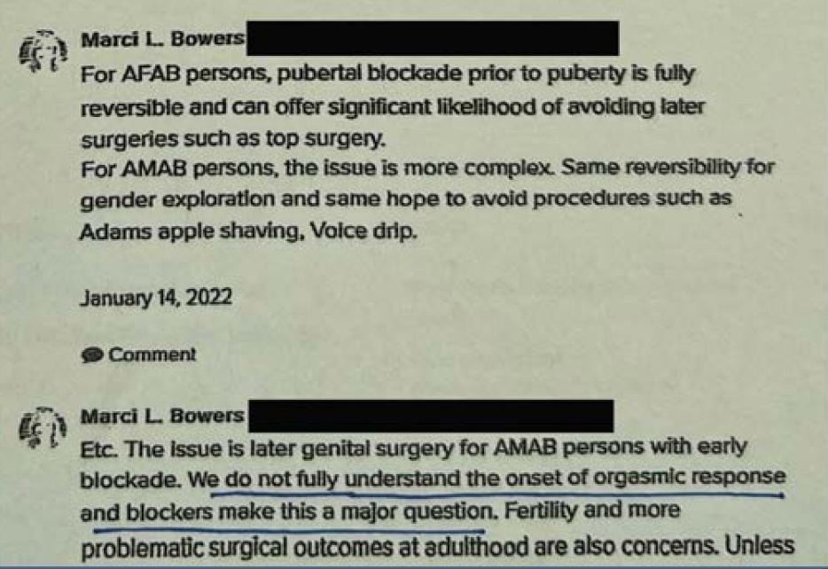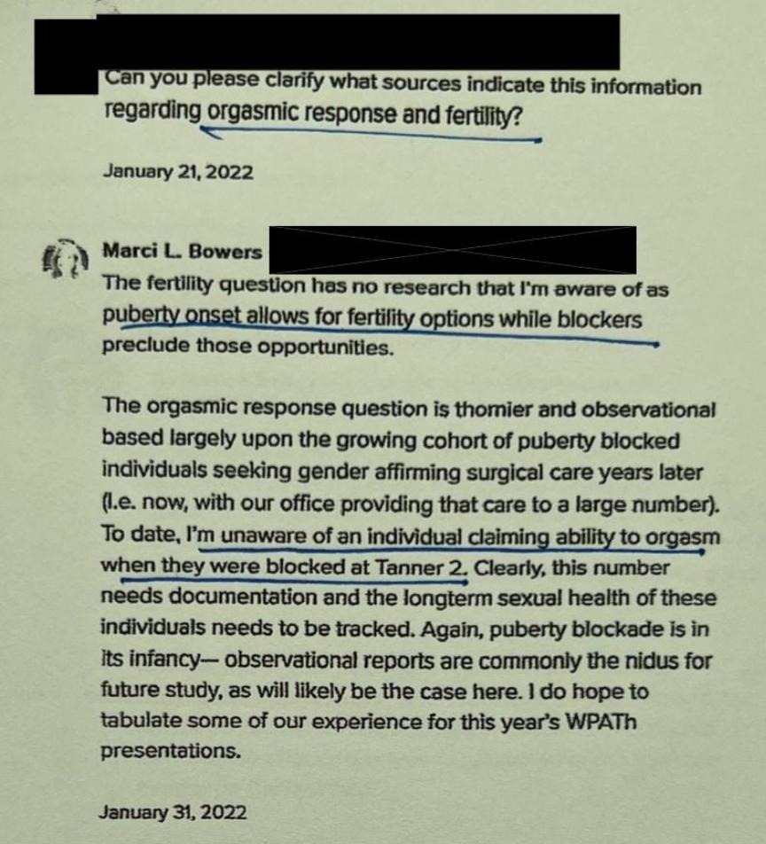 “I’m unaware of an individual claiming ability to orgasm when they were blocked at Tanner 2.” Many gender medicine patients lose sexual function, including experiencing orgasm. As such, they are not only deprived of sexual pleasure, they are significantly undermining their ability to form long-lasting romantic relationships. It’s clear from the Files that even many people within gender medicine do not understand this. On January 14, 2022, the surgeon and President of WPATH, Marci Bowers, explained this reality in a low-key way. Seven days later, a WPATH member asked Bowers to clarify.