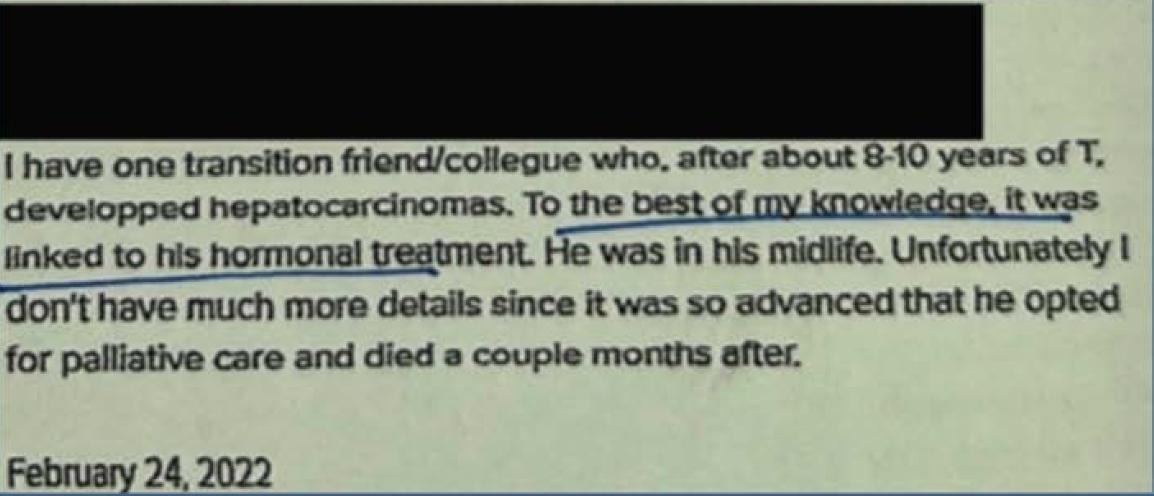 “After 8-10 years of [testosterone, they] developed hepatocarcinomas… died a couple of months after.” For some gender medicine patients, there are fates worse than both sterility and loss of sexual function.