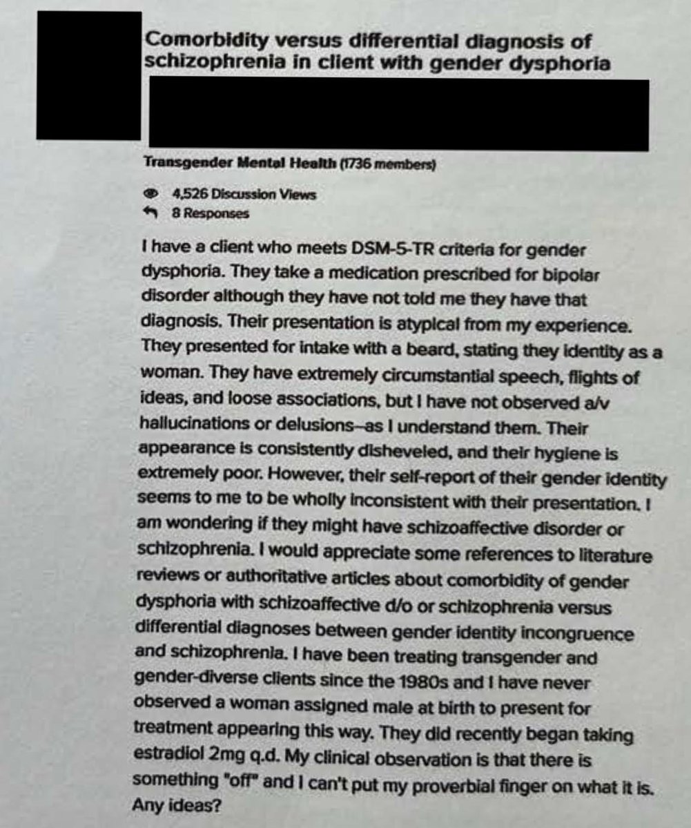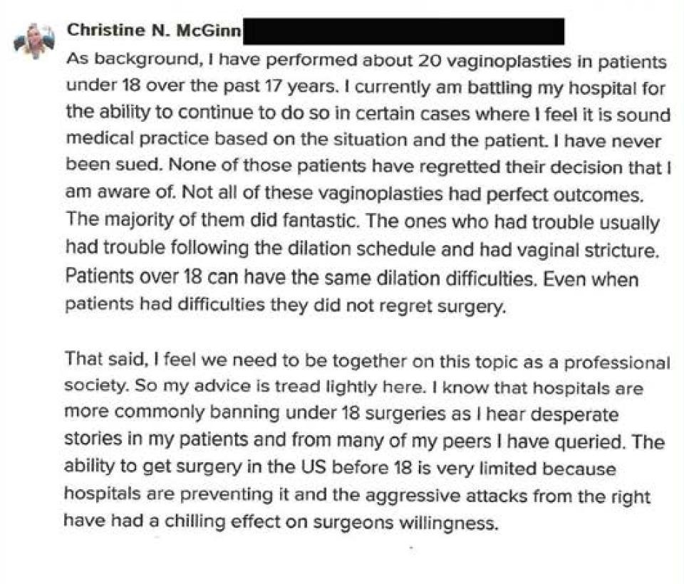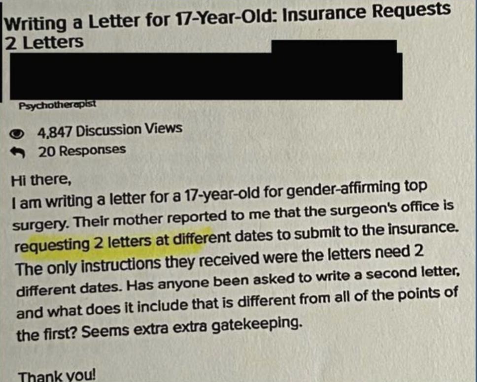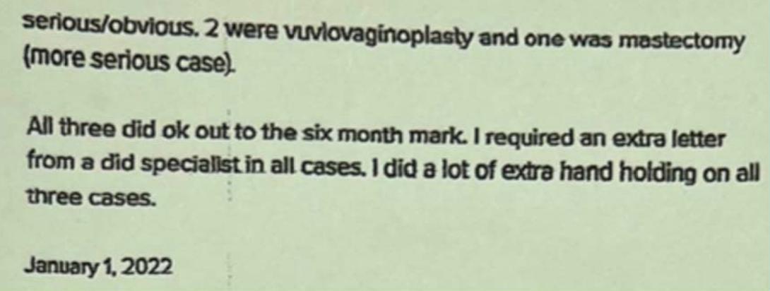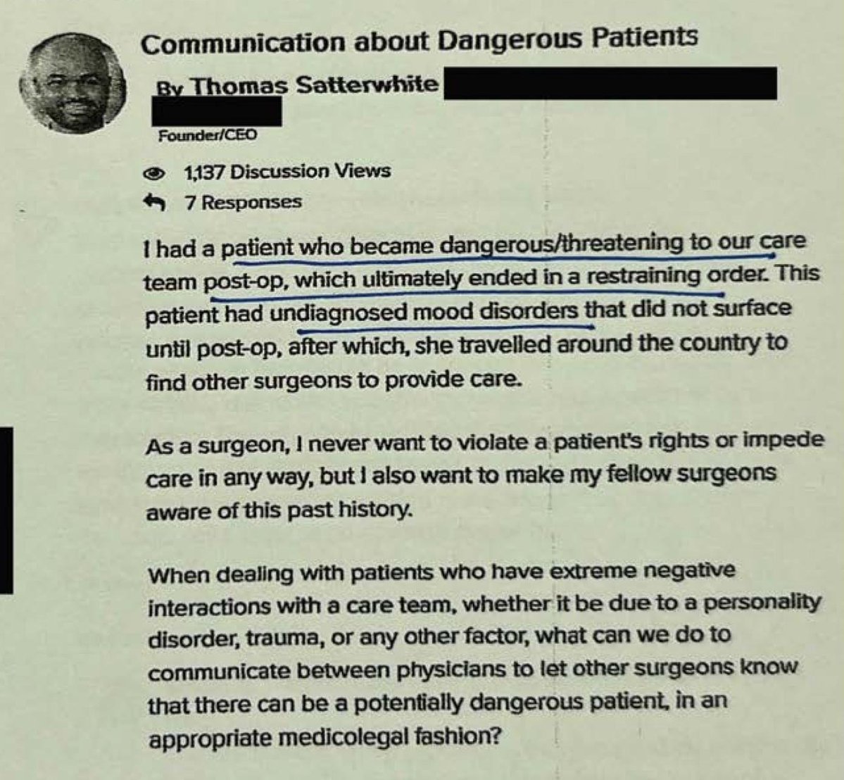 Part II: Mental Illness “A Patient Who Became Dangerous” On an unknown date, a San Francisco-based surgeon named Thomas Satterwhite posted an urgent new message to WPATH’s internal message board. “I had a patient who became dangerous/threatening to our care team post-op,” he wrote, “which ultimately ended in a restraining order.” Satterwhite explained that “This patient had undiagnosed mood disorders that did not surface until post-op, after which, she travelled around the country to find other surgeons to provide care.” It’s a chilling story, and one that raises many questions about the ethics and legality of gender-affirming medicine. At the top of that list is how did Satterwhite and his colleagues miss the fact that the person they operated upon had a serious psychiatric condition? But Satterwhite was focused on a more prosaic question: What was the best “medicolegal” way that he could warn other doctors and health care providers that his former patient was “potentially dangerous”? There is no evidence in the WPATH Files, nor elsewhere, that the experience shook Satterwhite enough to question whether gender-affirming care is, in reality, committed to the maxim, “First, do no harm.”