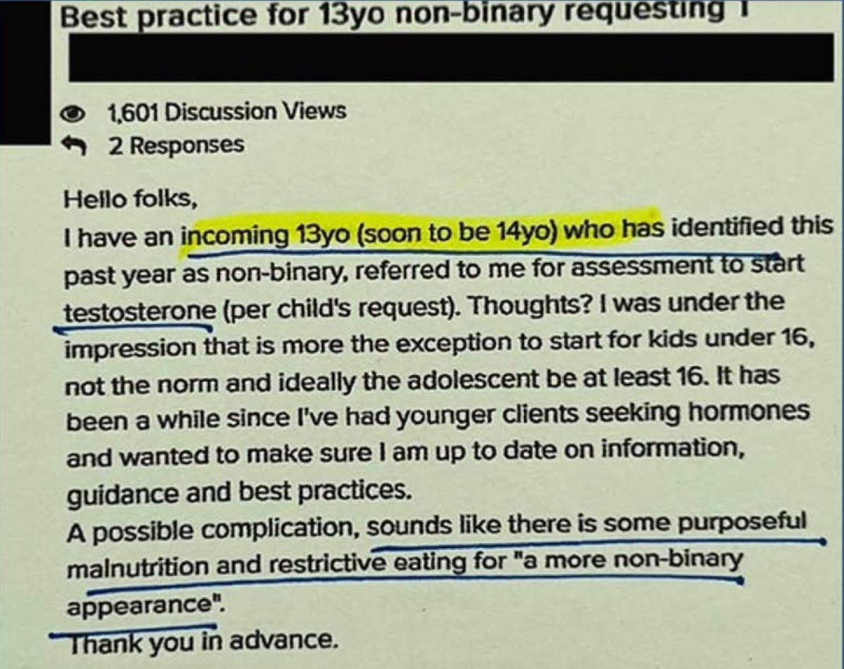 “Disordered eating,” “purposeful malnutrition,” and a “high prevalence of eating disorders” A therapist raises concerns in a message about the age of a patient. “I have an incoming 13yo (soon to be 14 yo)... I was under the impression that is more the exception to start for kids under 16, not the norm…” But the person has another piece of troubling information. “A possible complication,” the therapist warns, is that it “sounds like there is some purposeful malnutrition and restrictive eating for ‘a more non-binary appearance.’” The chief medical officer of a health center in Texas chimed in that the therapist had best hurry the 13-year-old teenager along the gender-affirming path because “waiting appears to increase the rate of suicide,” which is one of several pseudoscientific myths repeated within the WPATH Files.