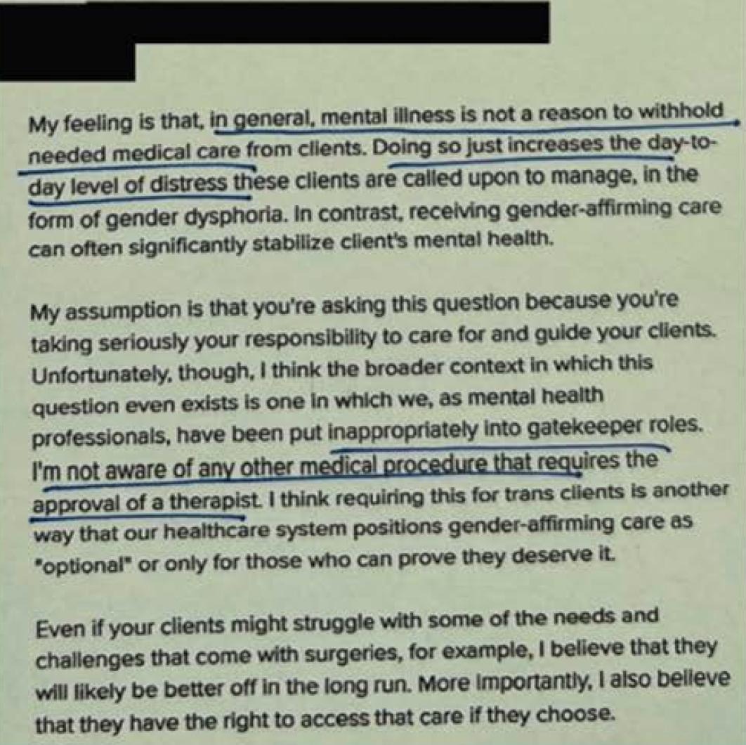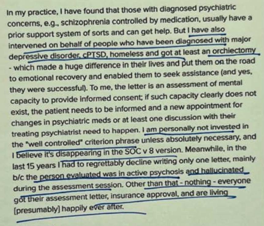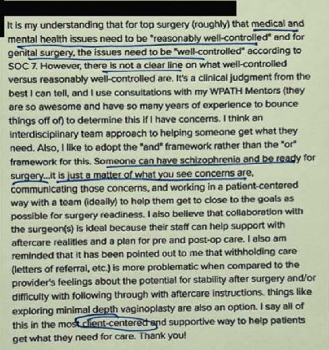 “Most of the kids are nowhere in any kind of brain space to really talk about it seriously.” One WPATH member says, “It's out of their developmental range sometimes to understand the extent to which some of these medical interventions are impacting them.” “We try to talk about it, but most of the kids are nowhere in any kind of a brain space to really, really, really talk about it seriously.”