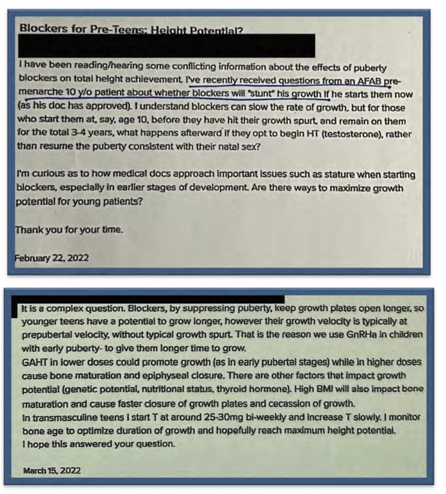 “I’ve recently received questions from an [‘Assigned Female At Birth’] pre-menarche 10 y/o patient about whether blockers will ‘stunt’ his growth…”