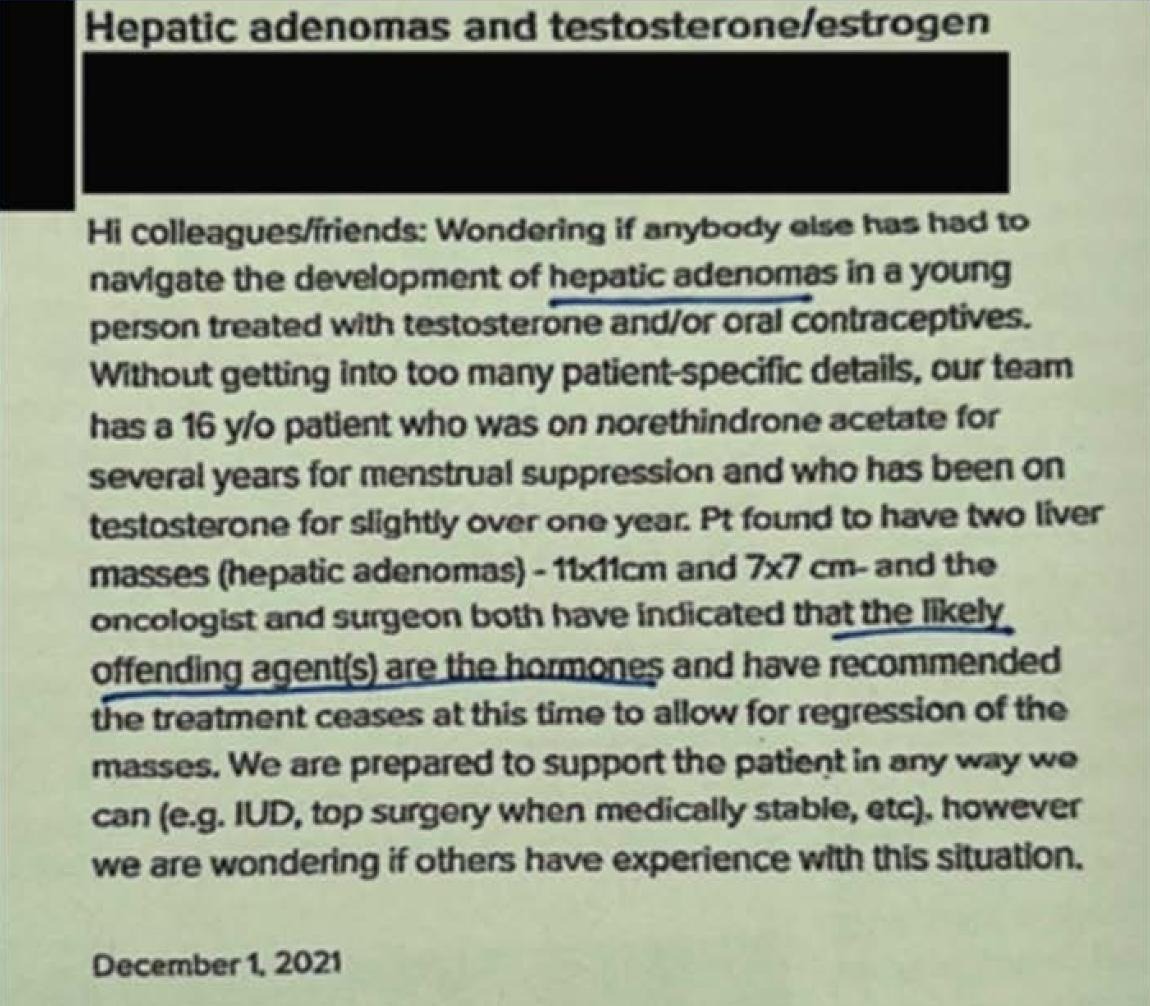 A “16 y/o patient…found to have two liver masses… the likely offending agents were the hormones…” The problem is that drugs can cause tumors, even, apparently, in people as young as 16 years old.