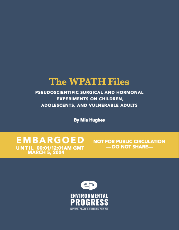 THE WPATH FILES Advocates of gender-affirming care say it’s evidence-based. But now, newly released internal files from the World Professional Association for Transgender Health (WPATH) prove that the practice of transgender medicine is neither scientific nor medical. American Medical Association, The Endocrine Society, the American Academy of Pediatrics, and thousands of doctors worldwide rely on WPATH. It is considered the leading global authority on gender medicine. And yet WPATH’s internal files, which include written discussions and a video, reveal that its members know they are creating victims and not getting “informed consent.” Victims include a 10-year-old girl, a 13-year-old developmentally delayed adolescent, and individuals suffering from schizophrenia and other serious mental illnesses. The injuries described in the WPATH Files include sterilization, loss of sexual function, liver tumors, and death. WPATH members indicate repeatedly that they know that many children and their parents don’t understand the effects that puberty blockers, hormones, and surgeries will have on their bodies. And yet, they continue to perform and advocate for gender medicine. The WPATH Files prove that gender medicine is comprised of unregulated and pseudoscientific experiments on children, adolescents, and vulnerable adults. It will go down as one of the worst medical scandals in history. https://environmentalprogress.org/big-news/wpath-files