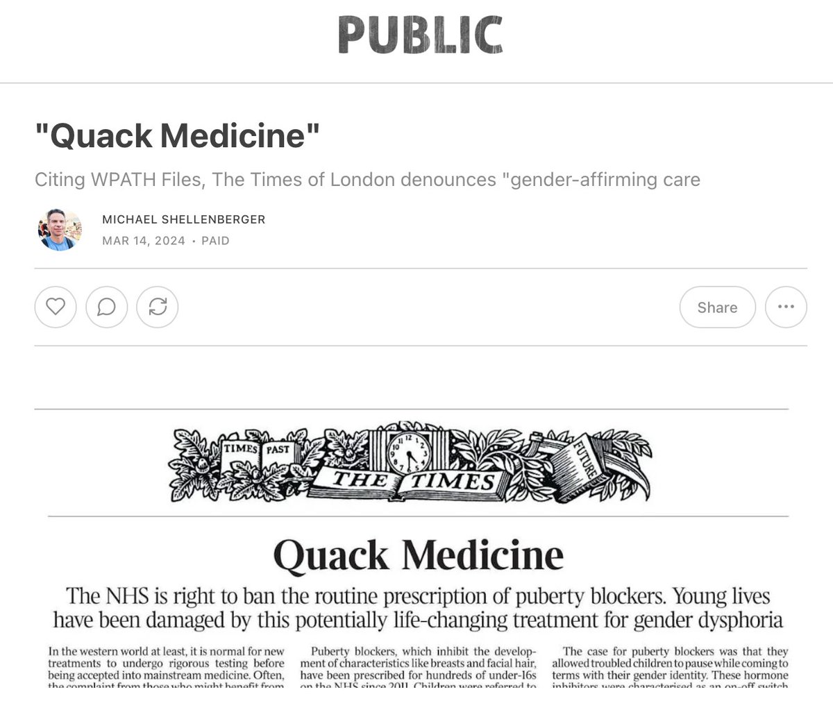 And a fix for gender dysphoria for gay and lesbian kids can be puberty itself, as it was for me and many of my gay male friends. Once my own hormones kicked in, my anxieties evaporated. I lovedbeing a boy, I realized. Puberty blockers literally block gay and lesbian kids from the chance at that possible resolution of their gender dysphoria. There is a real conflict here, and it’s obscured by the L.G.B.T.Q.+ identity.