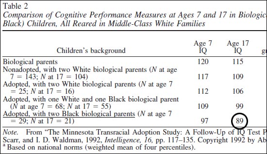 Results of IQ testing of children in the Minnesota Transracial adoption study. Children of various races were adopted at an early age and raised by upper middle-class white parents. IQ of adopted white kids at age 17: 106. IQ of adopted black kids at age 17: 89. https://t.co/KlyzWDInnq