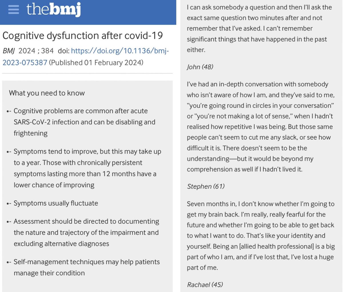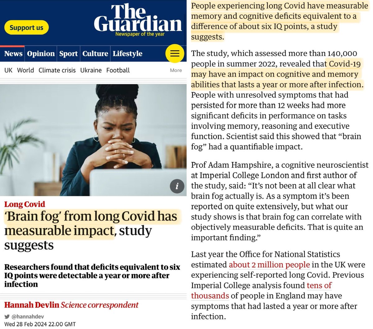 2. This is one of the new studies published this week (29 Feb 2024). Researchers found that those with Long Covid had measurable memory & cognitive deficits equivalent to a difference of 6 IQ points which lasted for a year or more after infection. 🔗 https://amp.theguardian.com/society/2024/feb/28/brain-fog-from-long-covid-has-measurable-impact-study-suggests