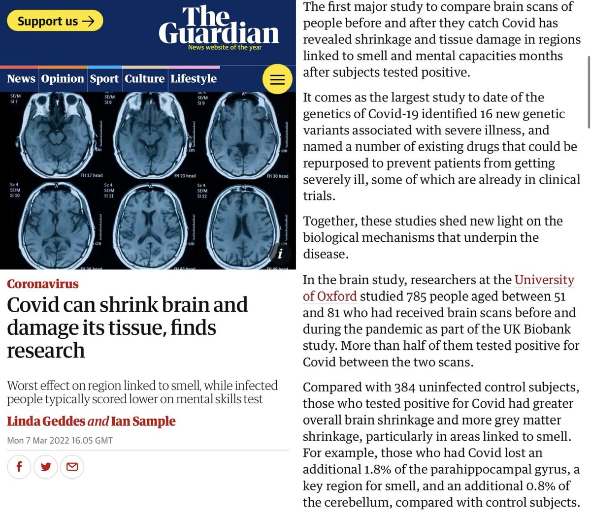 (12. Continued) This article in the Guardian reviewed the findings of that Oxford Uni Biobank study. “Those who tested positive for Covid had greater overall brain shrinkage and more grey matter shrinkage, particularly in areas linked to smell”. https://amp.theguardian.com/world/2022/mar/07/covid-can-shrink-brain-and-damage-its-tissue-finds-research