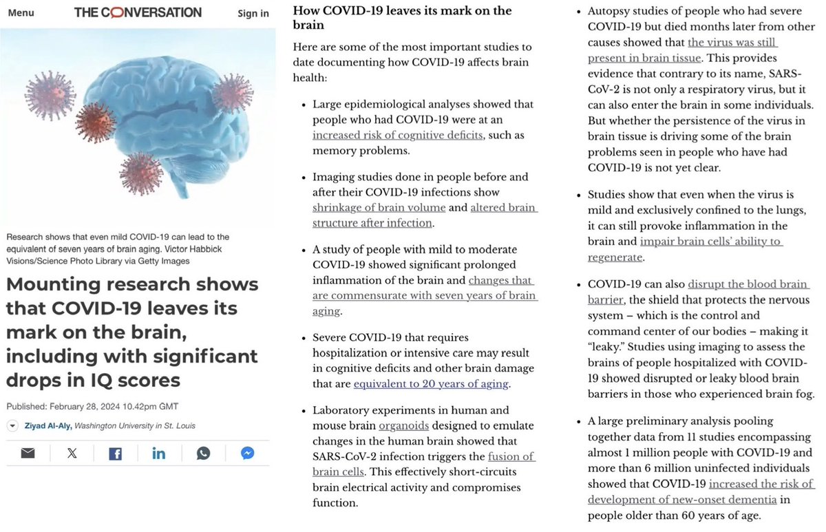 It’s important to note that this is not new news… we’ve known about Covid’s impact on the brain for a long time. 1. This article from Dr @zalaly provides an excellent summary of the mounting evidence about how Covid leaves its mark on the brain. 🔗 https://theconversation.com/mounting-research-shows-that-covid-19-leaves-its-mark-on-the-brain-including-with-significant-drops-in-iq-scores-224216