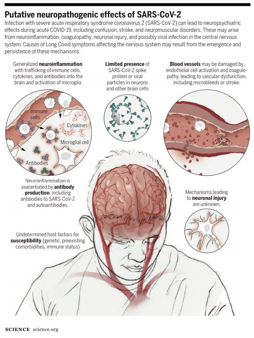 14. This article in Science discusses the putative neuropathogenic consequences of Covid  “Maladies such as impaired concentration, headache, sensory disturbances, depression, and even psychosis may persist for months after infection.” 🔗 https://science.org/doi/10.1126/science.abm2052