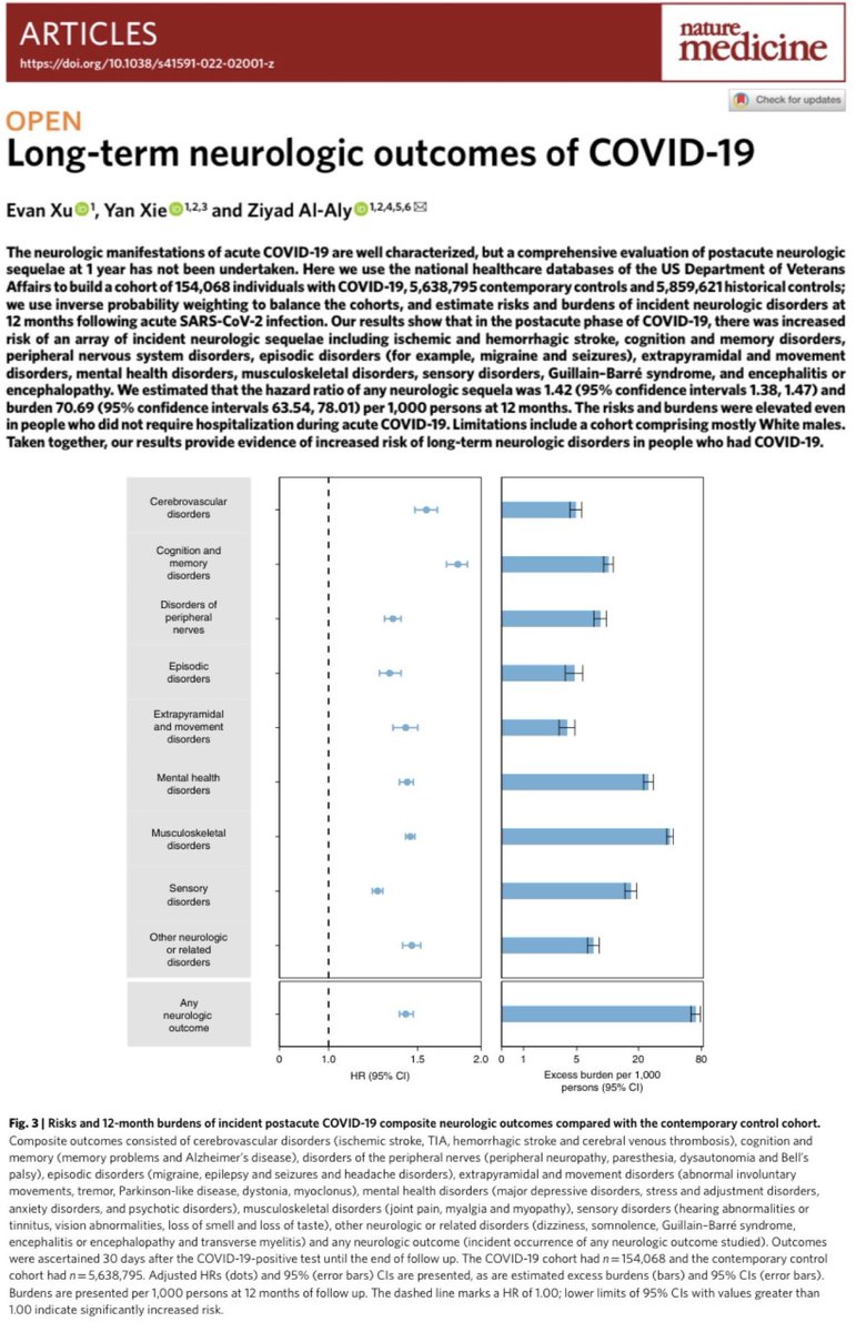 19. This huge study (published in Sept 2022) by Dr @zalaly analysed the neurologic outcomes of Covid infection at 1 year of 150k people vs 11m controls. Results showed that those infected with Covid had a significantly higher risk of brain disorders. 🔗 https://nature.com/articles/s41591-022-02001-z