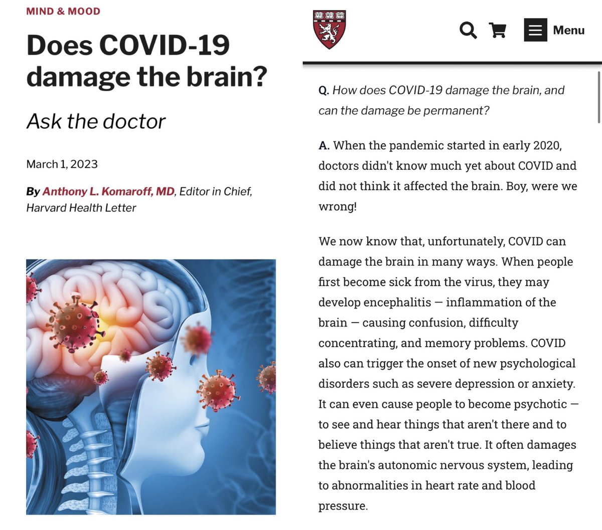 @zalaly 20. This is a succinct summary from the Editor in Chief of the Harvard Health Letter (published March 2023): “When the pandemic started in early 2020, doctors didn't know much yet about COVID & did not think it affected the brain. Boy, were we WRONG!” 🔗 https://health.harvard.edu/mind-and-mood/does-covid-19-damage-the-brain
