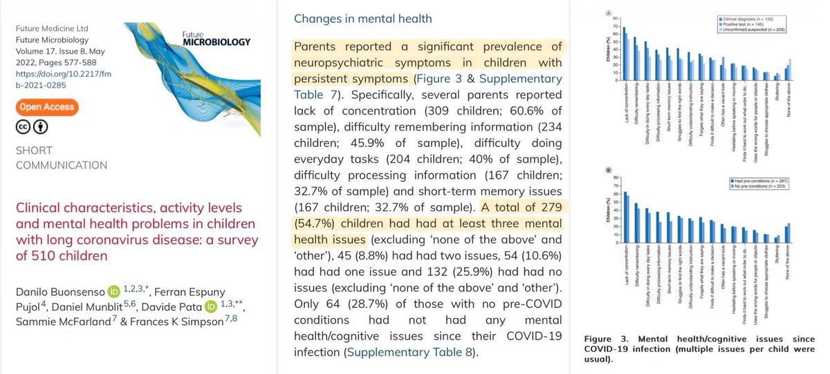 22. The study below (published in May 2022) investigated mental health symptoms amongst children suffering from Long Covid. 54.7% of children diagnosed with Long Covid had AT LEAST 3 mental health issues reported by their parents. 🔗 https://www.futuremedicine.com/doi/epub/10.2217/fmb-2021-0285