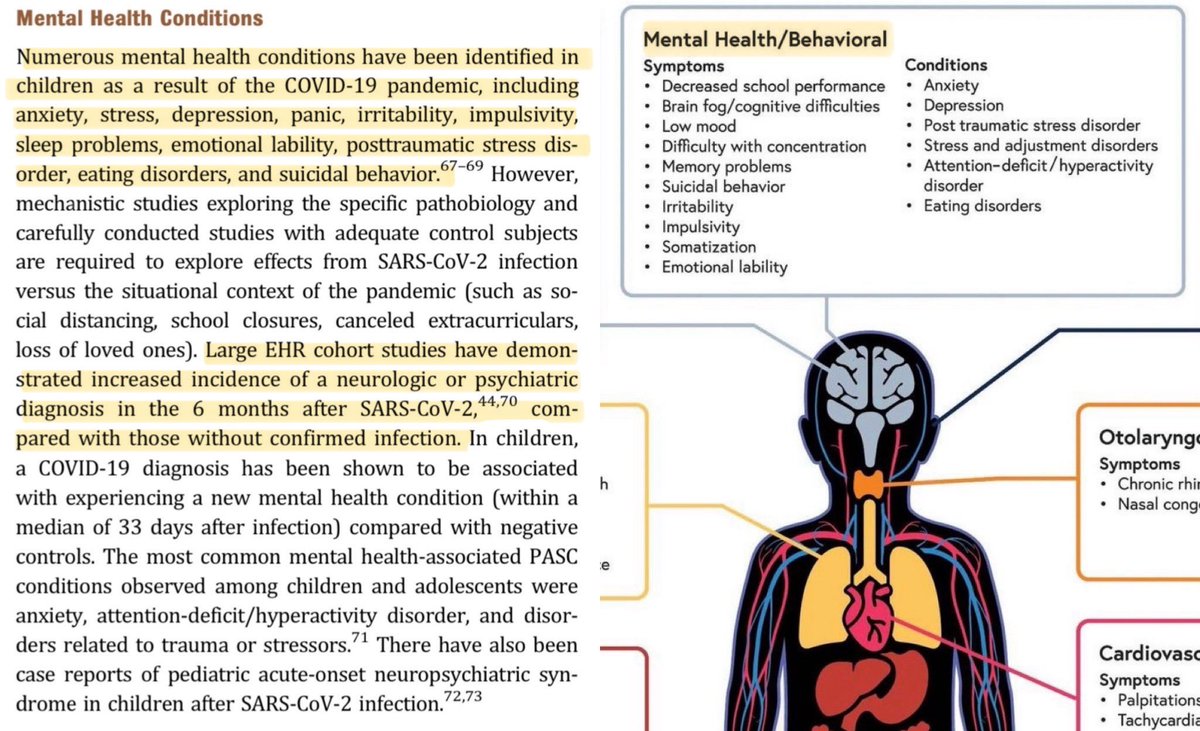 23. A state-of-the-art narrative review (published Feb 2024) provides a summary of our current knowledge about Long Covid in children. Below I’ve zoomed in on the section which describes the linkages between Covid & mental health issues in children. 🔗 https://publications.aap.org/pediatrics/article/153/3/e2023062570/196606/Postacute-Sequelae-of-SARS-CoV-2-in-Children