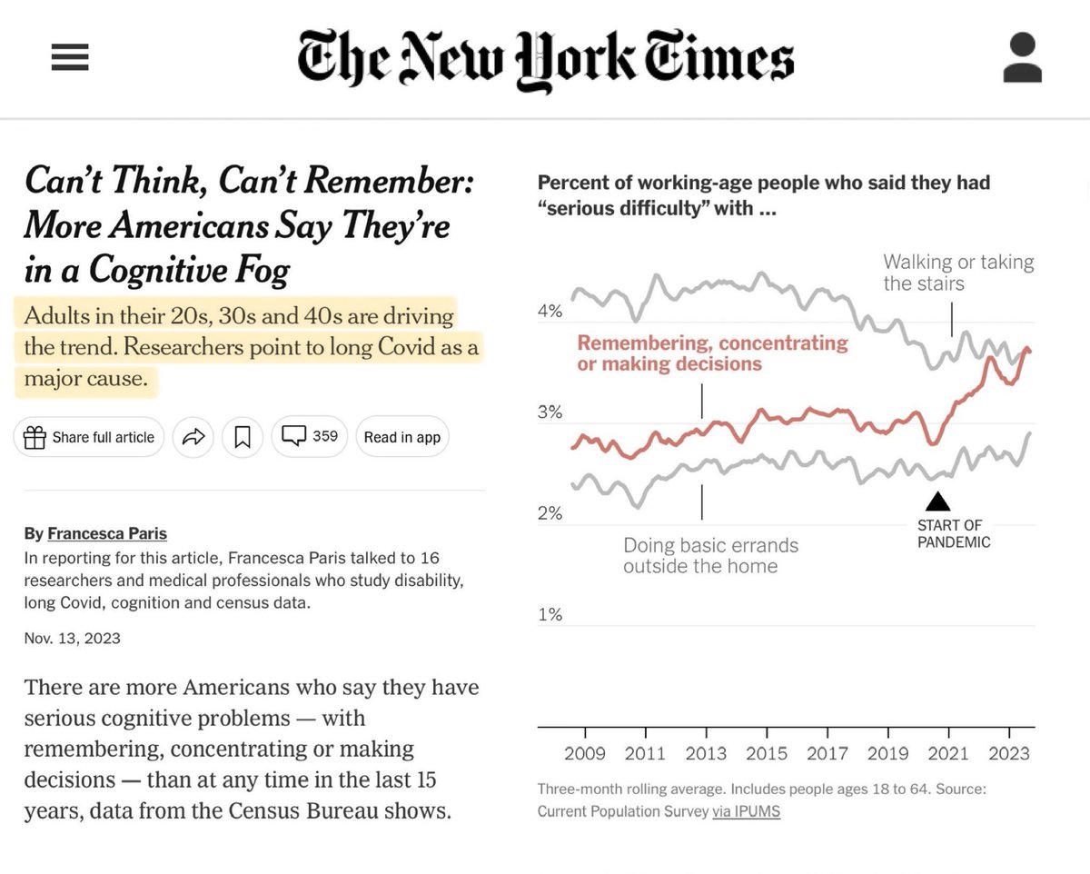 24. Data from the US Census Bureau (Nov 2023) shows that more Americans (esp. adults aged 20-50) now have problems remembering, concentrating or making decisions than at any time in the last 15 years. Researchers think Long Covid is a major cause. 🔗 https://nytimes.com/2023/11/13/upshot/long-covid-disability.html