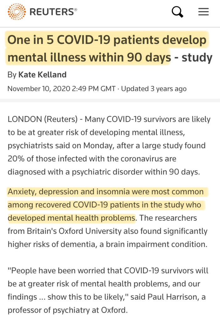 25. In this study (published Nov 2020), researchers studied linkages between Covid infection & onset of mental health issues. ▪️1 in 5 developed mental illness within 90 days of Covid infection ▪️Anxiety, depression & insomnia were most common issues 🔗 https://www.reuters.com/article/idUSKBN27P34O/