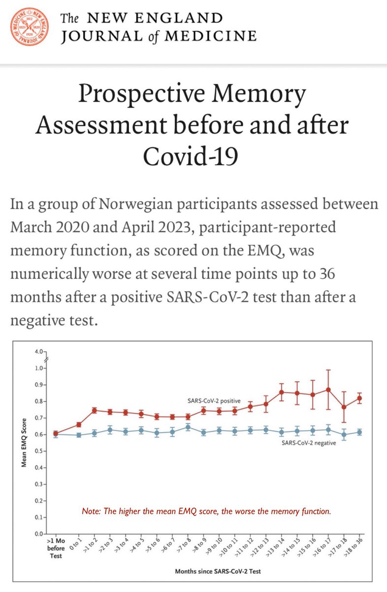 3. In another study published in the NEJM this week, researchers reviewed data from over 100k participants in Norway’s nationwide Covid Study. They found that participants’ memory function was worse after a positive Covid test than after a negative test. https://www.nejm.org/doi/10.1056/NEJMc2311200