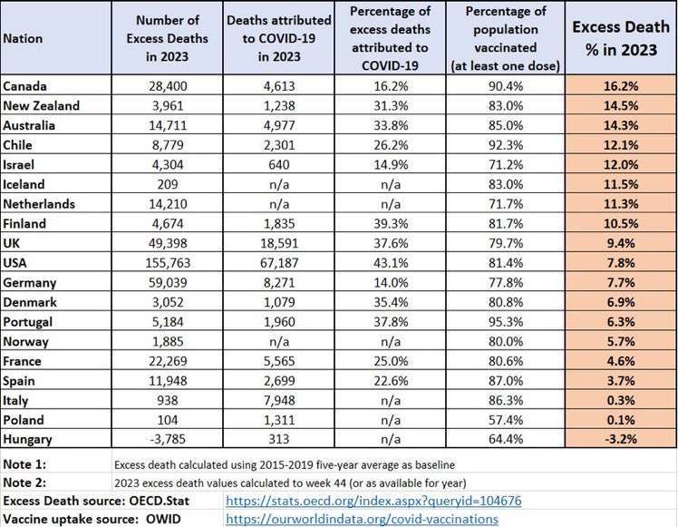 United Kingdom had an increase of 9.4% excess deaths in 2023. Canada, New Zealand, Australia were worse. None of the countries on this list had excess deaths during the so called pandemic. This trend will continue into 2024 and beyond. Yet no one bats an eyelid. https://t.co/aQBsL6QMBB