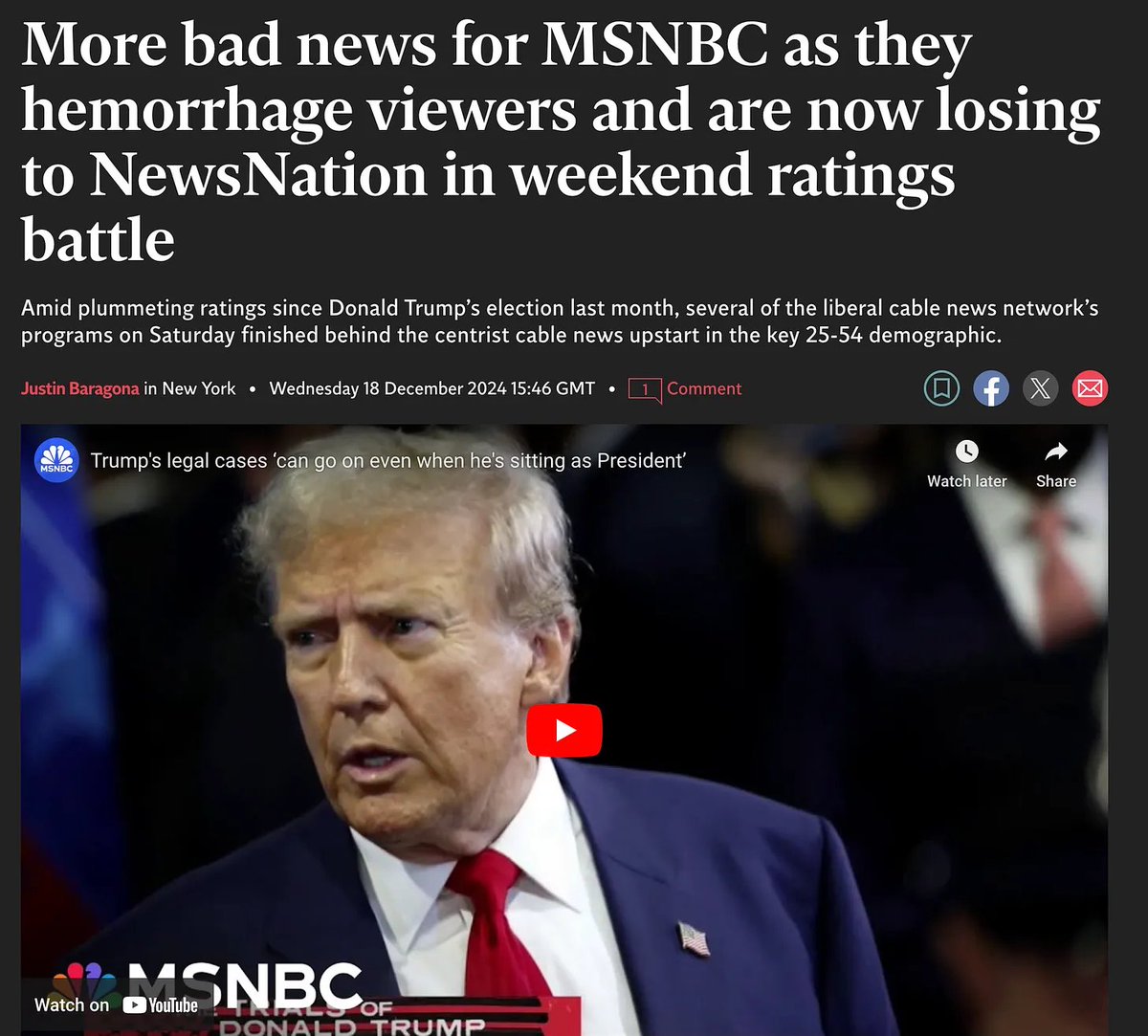#3 - More Bad News for MSNBC as They Hemorrhage Viewers and Are Now Losing to NewsNation Already dealing with sustained post-election ratings woes, MSNBC witnessed yet another embarrassment over the weekend when it finished behind the plucky TV startup NewsNation in the key advertising demographic of adults aged 25-54. According to Nielsen Media Research, the liberal cable news network averaged just 17,000 viewers in the key demo on Saturday between the hours of noon and 7 p.m. ET. In comparison, NewsNation’s programming attracted an audience of 23,000 in the 25-54 demographic in that same time period. Read More: https://www.independent.co.uk/news/world/americas/us-politics/msnbc-ratings-newsnation-donald-trump-b2666544.html
