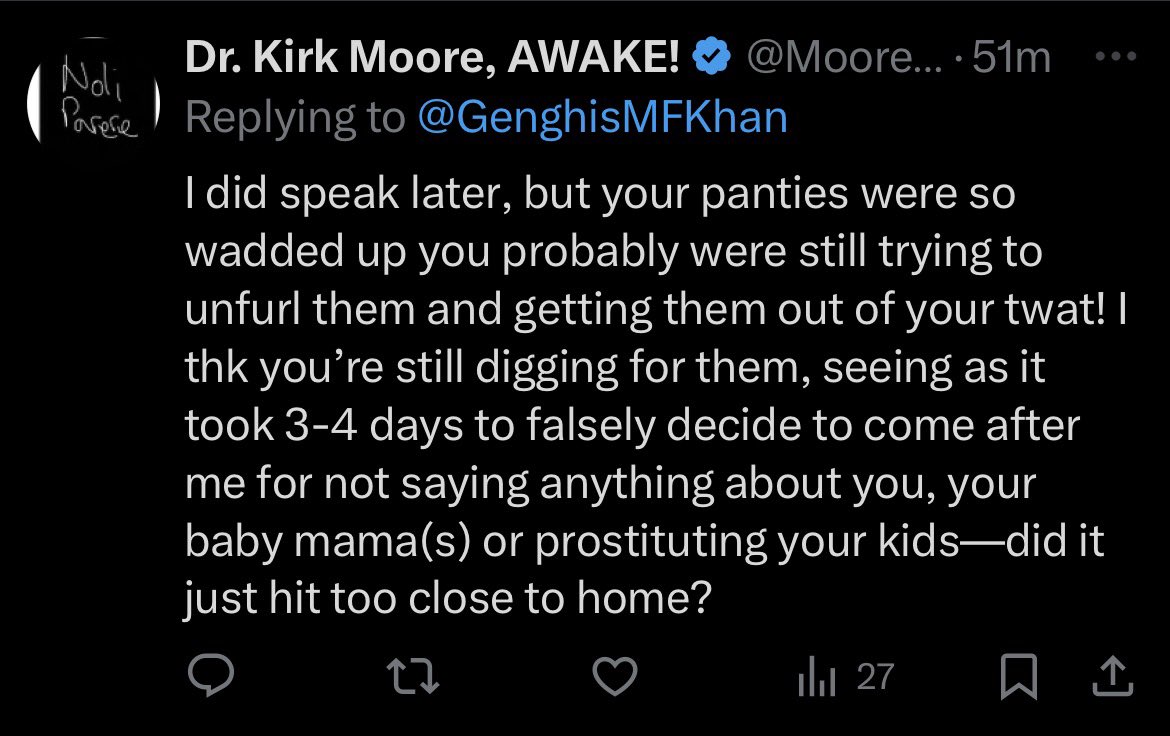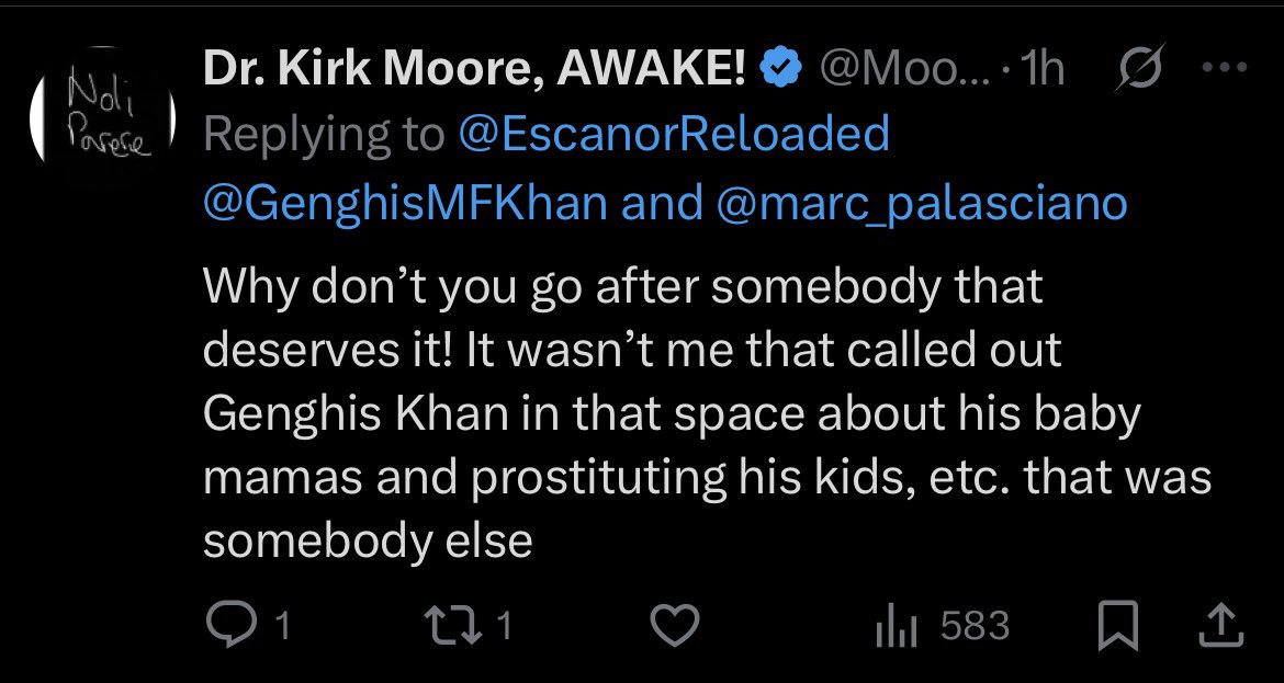 Ok folks. This one is over. As you can see the coward who started his day playing victim and claiming it wasn’t him has finally doubled down on what was said about my wife and kids and in doing so revealed his true character. I suspect everything about this guy is fake including his vaccine hero story which by all accounts was just a Mormon grift that he had @IanMalcolm84 and Co helping him push for coin. He’s not a real man. He has zero integrity or honor and is clearly as fake as a 3 dollar bill. I know it’s always hard for you guys to watch on as we dismantle these Controlled Op guys like Lego but in the end you see them for who they really are forever. Thank you for you support all the Moms, Nanas and brothers who helped with this guy. He’s cooked. Time for me to block him and move on. You guys have fun.😎 @EscanorReloaded 👊🏼H/T