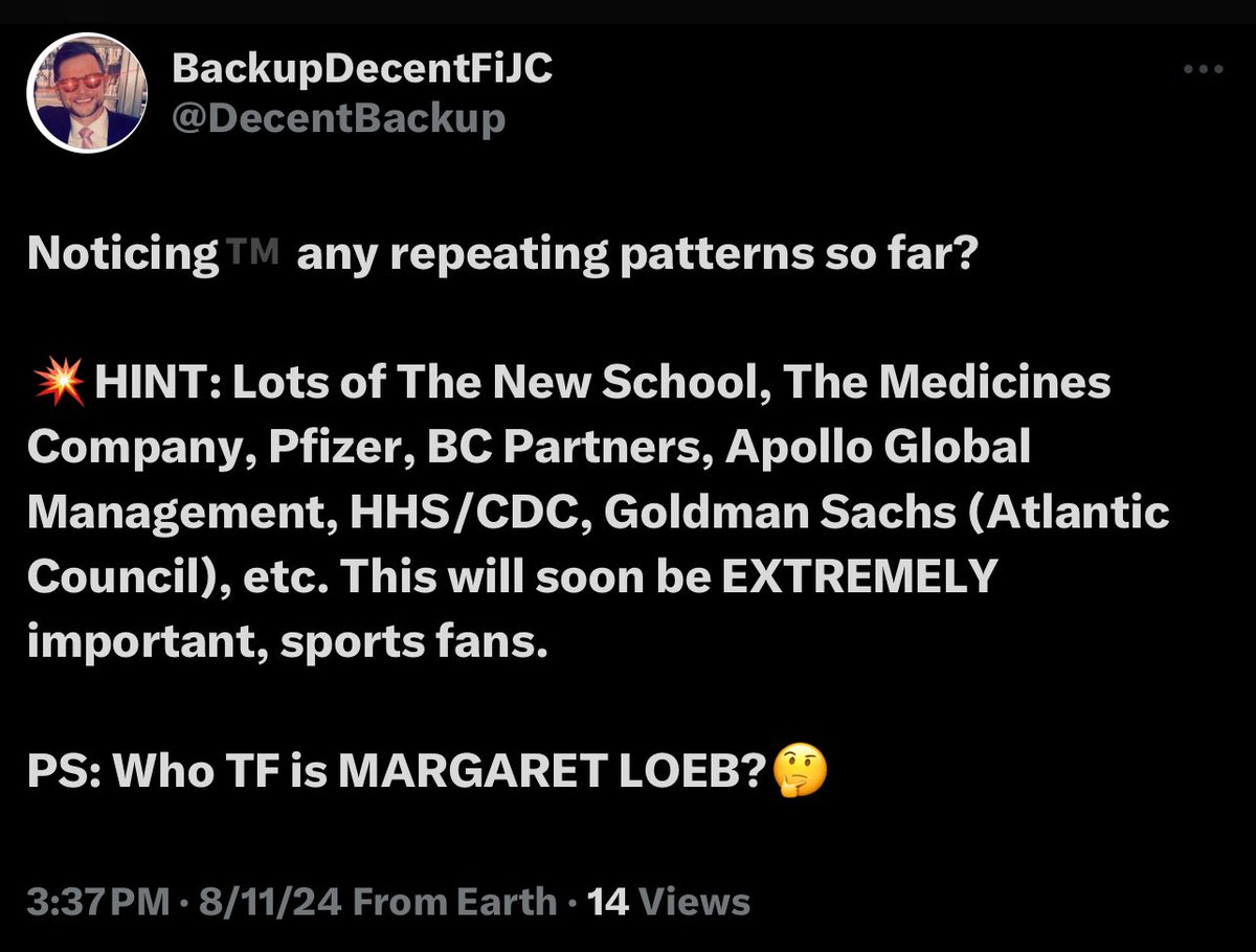 Noticing™️ any repeating patterns so far? 💥HINT: Lots of The New School, The Medicines Company, Pfizer, BC Partners, Apollo Global Management, HHS/CDC, Goldman Sachs (Atlantic Council), etc. This will soon be EXTREMELY important, sports fans. PS: Who TF is MARGARET LOEB?🤔