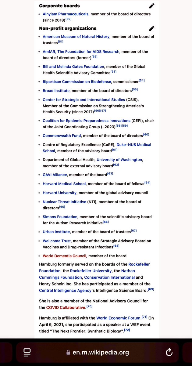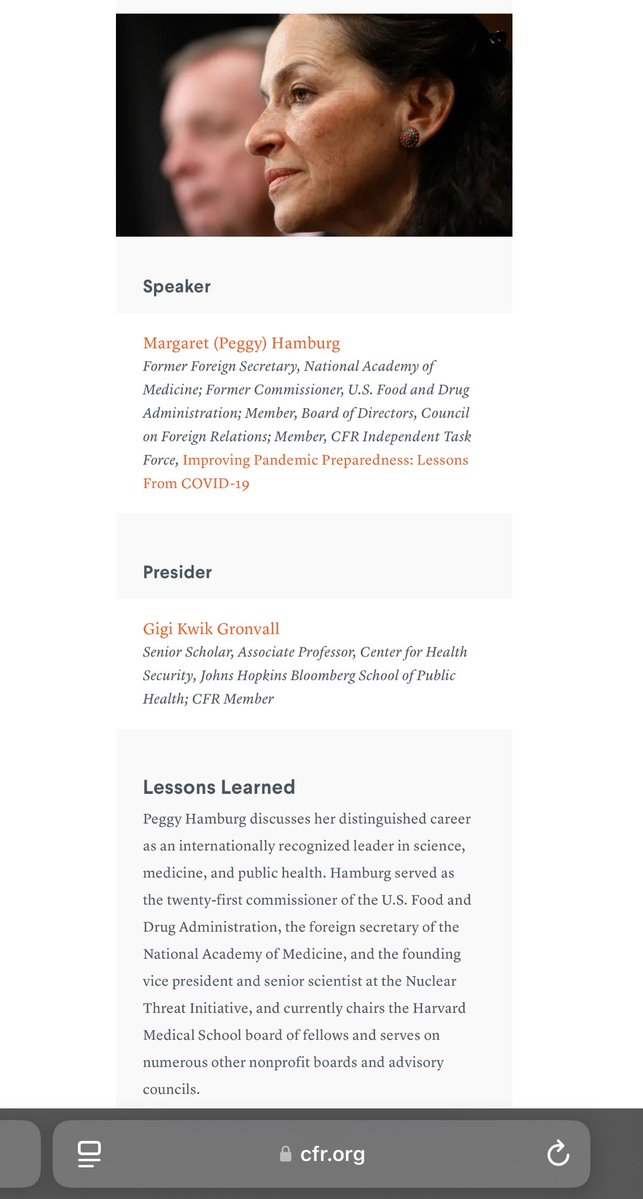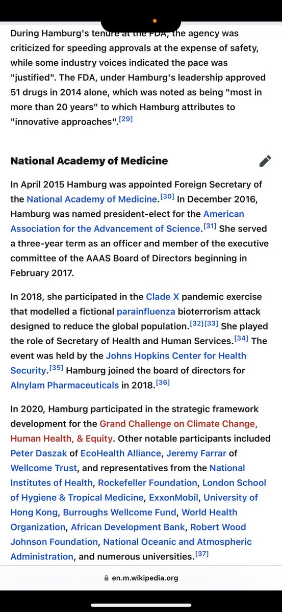 MARGARET HAMBURG (05/09-04/15) 💥💥💥💥💥💥💥💥💥💥💥💥💥 👺SPOILERS: This traitorous CIA/NIH/WELLCOME terrorist needs to be at or near the TOP of EVERYONE’S “COVID MOST WANTED” list. Period. Her BIO & TIMELINE are just STUNNING.🤯 Okie doke. Here we go… *MARGARET HAMBURG: Daughter of DR. DAVID A. HAMBURG, the PRESIDENT EMERITUS of CARNEGIE CORPORATION of NEW YORK, PRESIDENT of the NATIONAL ACADEMY OF MEDICINE and CHAIRMAN of the DEPARTMENT OF PSYCHIATRY & BEHAVIORAL HEALTH at STANFORD UNIVERSITY. 👺SANFORD WEILL: Chairman of CARNEGIE HALL and WEILL CORNELL MEDICAL. *She did her residency at NEW YORK HOSPITAL-CORNELL MEDICAL CENTER. *Worked with ANTHONY FAUCI at NIH during the AIDS “PANDEMIC” disaster. *Was NYC HEALTH COMMISSIONER during the first WTC BOMBING in 1993. 👺Founder of the Biodefense arm of the NUCLEAR THREAT INITIATIVE (NTI). 👺JUNE 2001: Participated in OPERATION DARK WINTER, conducted at ANDREWS AIR FORCE BASE, simulating a global BIOLOGICAL ATTACK by WEAPONIZED SMALLPOX. 😳😳😳😳😳 👺Became FDA COMMISSIONER in 2009, exactly two months after GILEAD SCIENCES successfully isolated the PARENT COMPOUND of REMDESIVIR. Led FDA the entire time GILEAD was working up to its full collaboration with NIH, CDC (2013) and the U.S. ARMY and AMRIID (2014). 👺2015: Appointed FOREIGN SECRETARY of the NATIONAL ACADEMY OF MEDICINE. 👺2018: Participated in CLADE X operation, hosted by JOHNS HOPKINS UNIVERSITY CENTER FOR HEALTH SECURITY, simulating a BIOLOGICAL ATTACK of a WEAPONIZED PARAINFLUENZA, designed to DECREASE THE GLOBAL POPULATION. I shit you, the fuck, not. 🤬🤬🤬🤬🤬 (Noticing™️ a recurring pattern here yet, sports fans? You should be.) 👺2020: Participated in the GRAND CHALLENGE ON CLIMATE CHANGE, HUMAN HEALTH, EQUITY. 🤣🤦🏻♂️ *Other notable participants included: 👺JEREMY FARRAR: Wellcome Trust 👺PETER DASZAK: EcoHealth Alliance AND REPS FROM… NIH WELLCOME BURROUGHS (Nancy Andrews) ROCKEFELLER FOUNDATION EXXONMOBIL WHO UNIVERSITY OF HONG KONG (Li Ka-Shing) ROBERT WOOD JOHNSON FOUNDATION NOAA 🤦🏻♂️🤬🤦🏻♂️🤬🤦🏻♂️ 👺MARGARET HAMBURG’S current/former affiliations might as well be a confession: ✅MARGARET A. HAMBURG *PRESIDENT’S INTELLIGENCE ADVISORY BOARD, Vice Chair *INTERACADEMY PARTNERSHIP, Co-President *NUCLEAR THREAT INITIATIVE (NTI), Board *NUCLEAR THREAT INITIATIVE (NTI), Bio Advisory Group *DUKE-NUS MEDICAL SCHOOL, Advisory Board *CENTRAL INTELLIGENCE AGENCY (CIA), Intelligence Science Board *COVID COLLABORATIVE, National Advisory Council *WELLCOME TRUST, Strategic Advisory Board on Vaccines and Drug-Resistant Infections *WORLD ECONOMIC FORUM (WEF), Synthetic Biology *COALITION FOR EPIDEMIC PREPAREDNESS INNOVATIONS (CEPI), Chairman of the Joint Coordinating Group *COUNCIL ON FOREIGN RELATIONS *HARVARD MEDICAL SCHOOL, Board of Fellows *HARVARD UNIVERSITY, Global Advisory Council *ALNYLAM PHARMACEUTICALS, Board *ROCKEFELLER FOUNDATION, Board *ROCKEFELLER UNIVERSITY, Board *BIPARTISAN COMMISSION ON *BIODEFENSE, Commissioner *GAVI ALLIANCE, Board *BILL & MELINDA GATES FOUNDATION, Global Health Scientific Advisory Committee *CENTER FOR STRATEGIC AND INTERNATIONAL STUDIES (CSIS), Commission on Strengthening America’s Health Security *COMMONWEALTH FUND, Board (Please, keep going. Believe it or not, there’s more… LOTS more.)