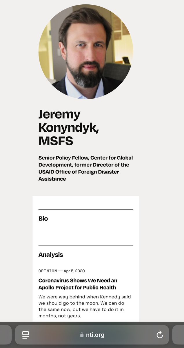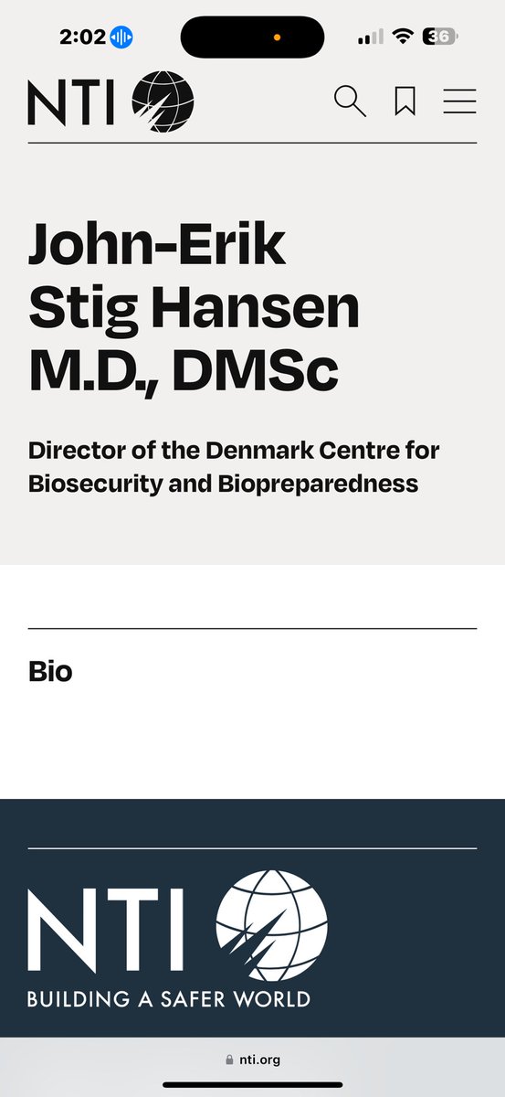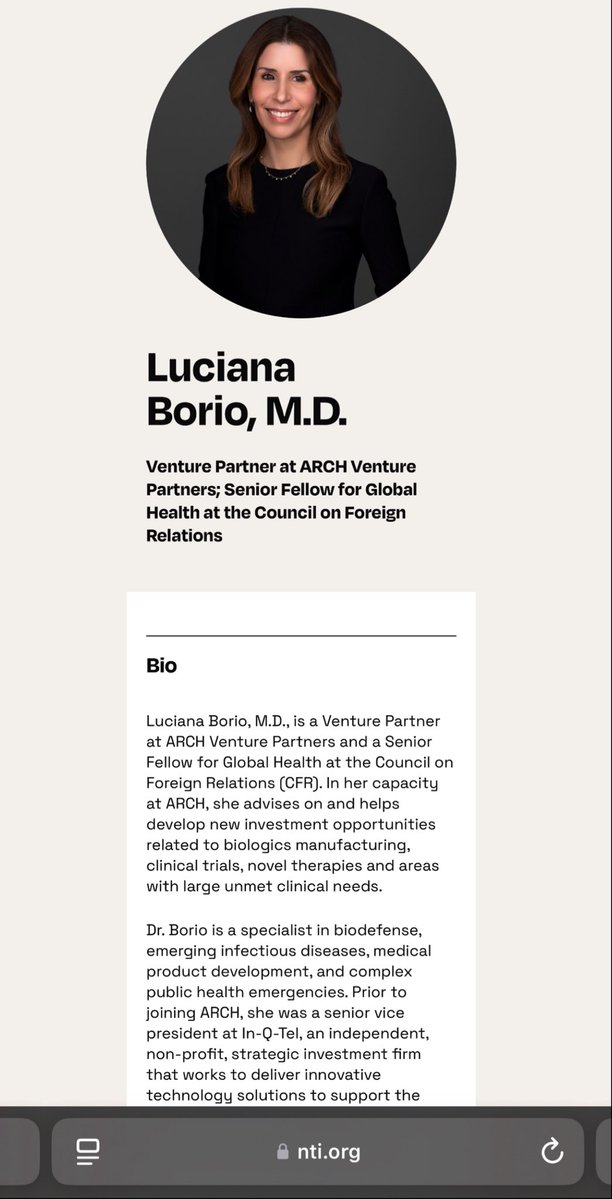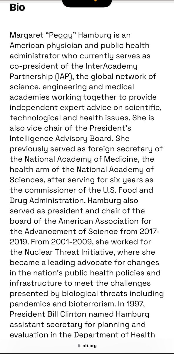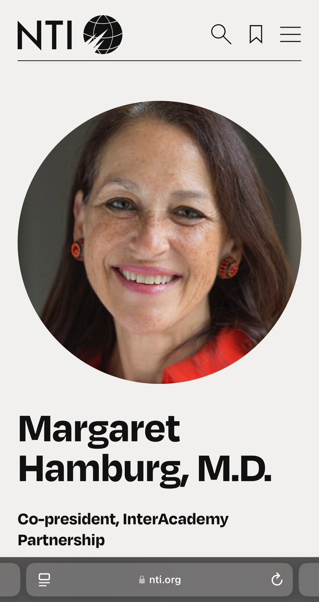 NUCLEAR THREAT INITIATIVE 💥💥💥💥💥💥💥💥💥💥 NTI BOARD OF DIRECTORS *At NTI, MARGARET HAMBURG (CIA/Wellcome/Duke-NUS) serves on the NTI BOD alongside… ✅GIDEON FRANK *ISRAELI ATOMIC ENERGY COMMISSION, Director General ✅LUCIANA BORIO *IN-Q-TEL (CIA), Senior Vice President *ARCH VENTURE PARTNERS, Venture Partner *COUNCIL ON FOREIGN RELATIONS, Senior Fellow for Global Health NTI BIO ADVISORY GROUP *At NTI, MARGARET HAMBURG serves on the NTI BIO ADVISORY GROUP alongside… ✅RESHMA SHETTY *GINKGO BIOWORKS (CIA), Co-Founder ✅JEREMY KONYNDYK *USAID OFFICE OF FOREIGN DISASTER ASSISTANCE, Director *CENTER FOR GLOBAL DEVELOPMENT, Senior Policy Fellow ✅JOHN-ERIK STIG HANSEN DENMARK CENTRE FOR BIOSECURITY AND BIOPREPAREDNESS, Director (Denmark, eh?)