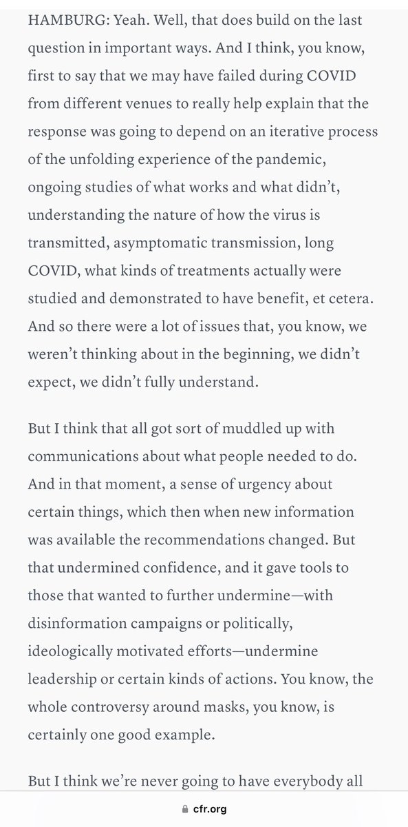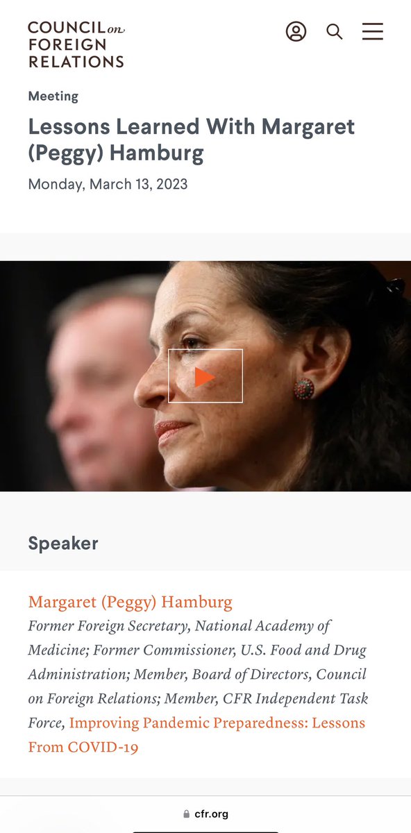 COUNCIL ON FOREIGN RELATIONS 💥💥💥💥💥💥💥💥💥💥💥💥 “Lessons Learned with Margaret (Peggy) Hamburg” - March 13, 2023 -Presider, Gigi Kwik Gronvall (🤦🏻♂️🤬) GRONVALL: “We have a question from the virtual audience.” OPERATOR: “Our next question will come from AMY MAXMEN.” (FUCK Amy Maxmen.🤦🏻♂️🤬) MAXMEN Q: “Hi. Thanks a lot. I actually had a follow-up to that question, so that was good timing for me. So about misinformation, so what we saw in this pandemic is that a lot of misinformation actually comes from, you know, within the government. And you saw that at multiple times during the pandemic. I saw just recently that the CDC and the FDA sent a letter to Florida’s surgeon general about sort of the antivaccine misinformation he’s been promoting. Are there any ideas, you know, within the FDA to make sure that it is not kind of falling prey to politicization? 💥You know, like as we saw with HYDROXYCHLOROQUINE?💥 And also moves to make sure that there’s kind of a more one government response in terms of this is—this is what the best science says right now? Because I think that just contributed to so much misinformation and politicization of all sorts of information.” HAMBURG: “Yeah. Well, that does build on the last question in important ways. And I think, you know, first to say that we may have failed during COVID from different venues to really help explain that the response was going to depend on an iterative process of the unfolding experience of the pandemic, ongoing studies of what works and what didn’t, understanding the nature of how the virus is transmitted, asymptomatic transmission, long COVID, what kinds of treatments actually were studied and demonstrated to have benefit, et cetera.” 👺NOTE: As much as you THINK you hate these people, I assure you, it’s not enough. And this is just ONE of the former FDA COMMISSIONERS. Lol.