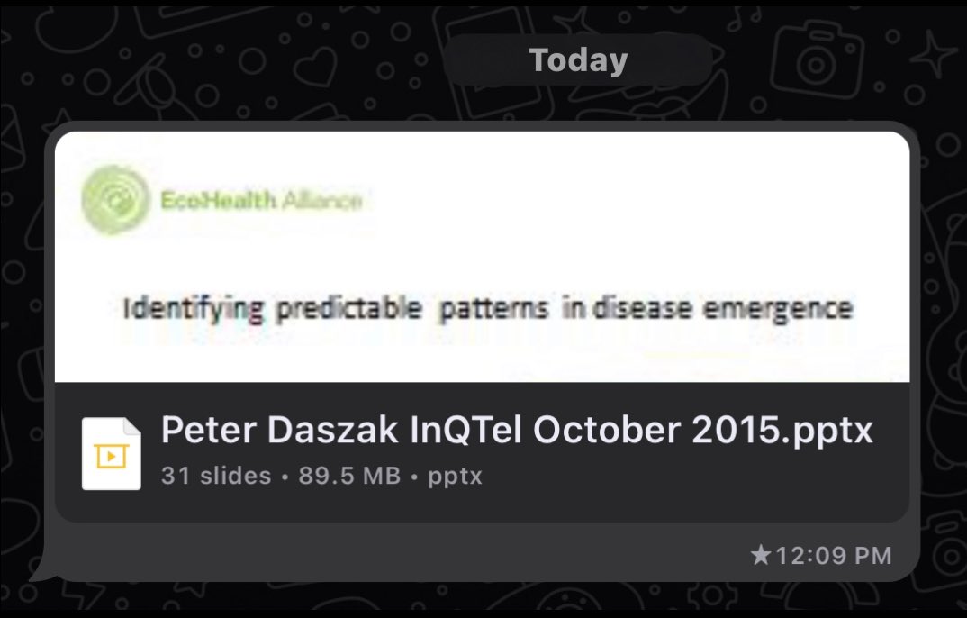 Speaking of IN-Q-TEL, turns out they worked with ECOHEALTH too! Here’s a 2015 presentation PETER DASZAK of EHA gave to IN-Q-TEL that October. This is in ADDITION to work we’ve known they did w/HUNTER BIDEN & NATHAN WOLFE at METABIOTA! This @AGHuff dude seems to know his shit.😎 https://t.co/arlBlq4632