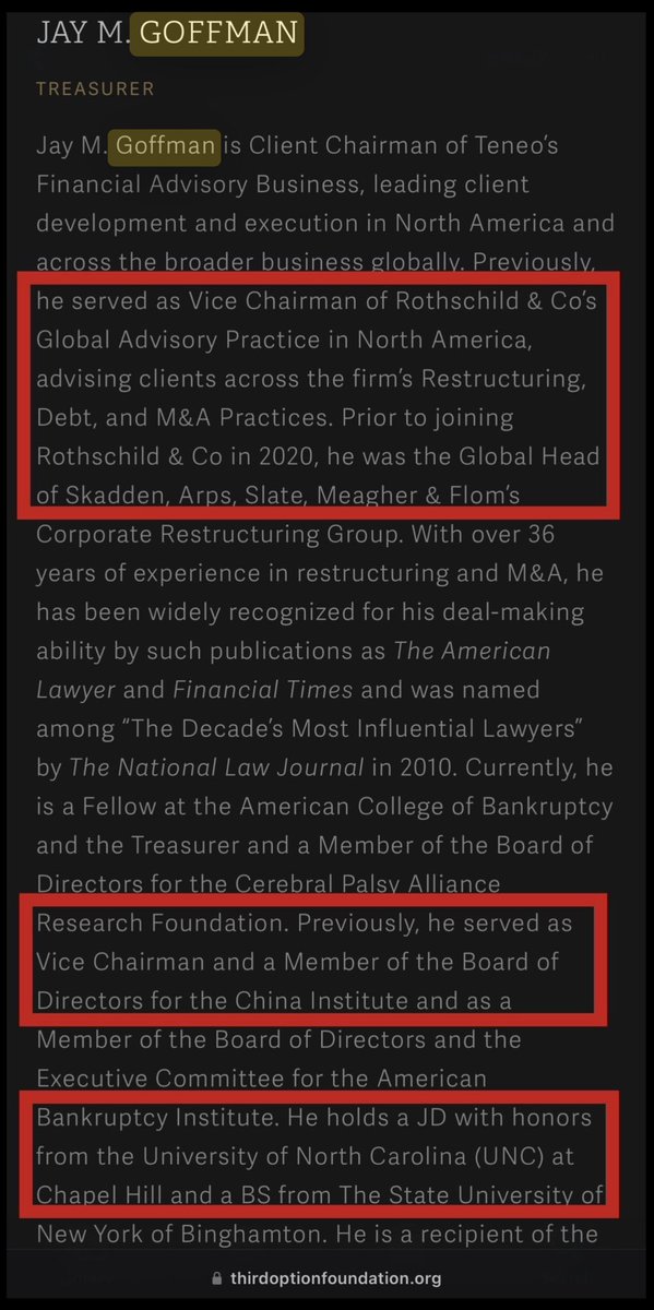 GOLLY JEEPERS! Would you just LOOK AT THAT! THIRD OPTION FOUNDATION TREASURER is THIS fa***t: ✅JAY GOFFMAN *He’s CLIENT CHAIRMAN of TENEO & was VICE CHAIRMAN of ROTHSCHILDS & CO! *Before THAT, he was GLOBAL HEAD of SKADDEN, ARPS, MEAGHER & FLOM (the JULES KROLL starter kit)! https://t.co/FbsSIZq4kq