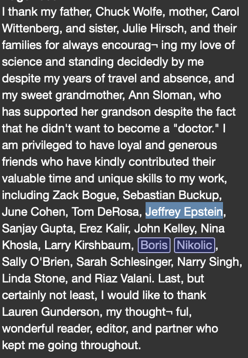 2) So Nathan Wolfe is a virologist that calls himself the “Virus Hunter”. @virushunter He wrote a book in 2012, “The Viral Storm: The Dawn of a New Pandemic Age”. He warned that Humans are becoming more susceptible to pandemics and that we will see many pandemics in the future. He claims the only way to stop these future pandemics, it is to hunt down new animal pathogens before they can jump to humans, genetically enhance these animal pathogens to “gain the function” of infecting humans (aka bioweapon production), so we can study these human-engineered pathogens, and make vaccines for them preemptively JUST IN CASE these animal pathogens mutate this way naturally, so we have the medical deterrent on hand. This dude literally wrote the book on how they created SARS-CoV-2 and the “vaccines”. He wrote a book preemptively justifying his future bioweapon production. But that’s not all. He thanked 16 people for their assistance with all the information in his book, and one of the people he thanked was none other than Jeffrey Epstein himself. What does Epstein know about virology? Shout out to @hash_tigre for this thread in 2021.