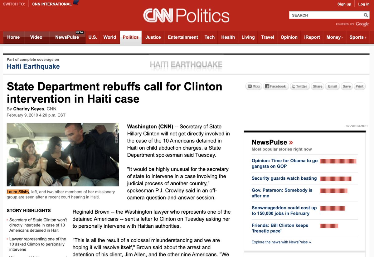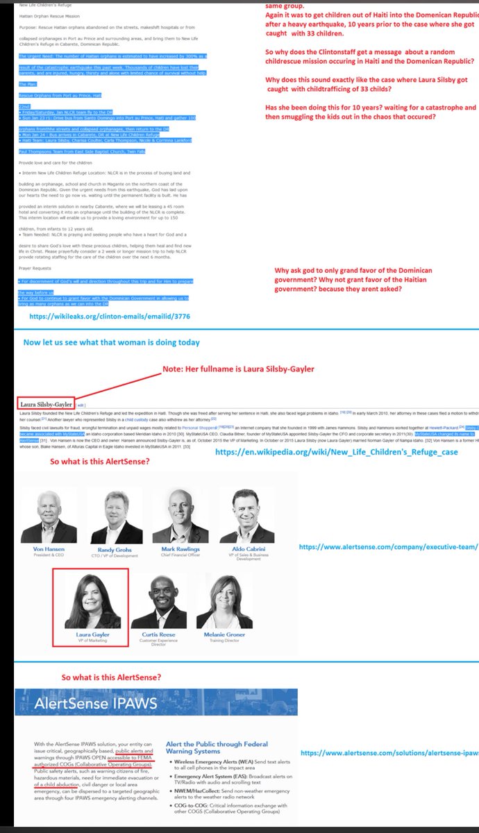 🚨Laura Silby- was arrested for trafficking 33 children in Haiti 🇭🇹 while she worked for the Clinton Foundation / Clinton Global Initiative in 2010. She and Charisa Coulter, were planning to start an orphanage, New Life Children's Refuge, in the Dominican Republic. Clinton FDN had long has a presence in Haiti since the 1990s. In fact Haiti is where HRC & Bill spent their honeymoon. They even sought a witch doctor during their stay. See pic of HRC visiting orphanages in Haiti w/ George Soros in 1998. The media really downplayed the significance of this arrest as it should have been made public that many of the CGI/ CFDN employees were also members of the NXIVM cult trafficking ring. NXIVM ring extended far and wide from Canada, across the US and with its strongest presence in a Mexico. Years later after jail time. Laura Silby became Laura Gayler and was offered a job with **MyStateUSA** an Idaho corporation based Meridian Idaho. This job was allegedly arranged by Ghislaine Maxwell’s sister Christine. Claudia Bitner, founder of MyStateUSA appointed Gayler as the CFO. **MyStateUSA** changed its name to **AlertSense** . Von Hansen is now the CEO and owner. Hansen announced Gayler is, as of, October 2015 the VP of Marketing. AlertSense is now called Konexus. AlertSense offers a “highly intuitive mass notification solution that simplifies alert creation & help mobilize and manage the emergency response teams." This private company supplies early response cell-based equipment that a few dozen states **use for their AMBER ALERT systems** as well as hazardous weather and emergency preparedness update systems. IPAWS Integrated Public Alert & Warning System (IPAWS) is FEMA's national system for local alerting people of an emergency. A woman once convicted for trafficking works for the tech firm behind AMBERALERT .. that is also used by FEMA. 😳🤯 @Redmrd1 @DecentBackup