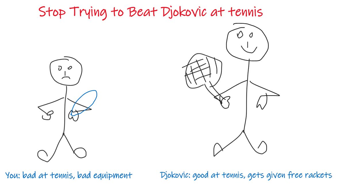 stop trying to beat djokovic at tennis. the first fundamental problem traders run up against is that there's no beginners' market. you gotta compete for good prices with the best in the market. this is a problem. there are a lot of people better at markets than you.