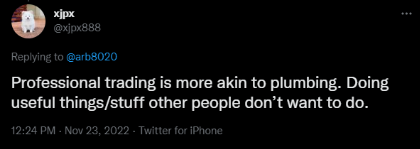 trading is like plumbing. you want to be doing useful things that other people don't want to do. you don't want to be trying to out-smart and out-gun other traders in a highly competitive zero sum game. you can't win like that.