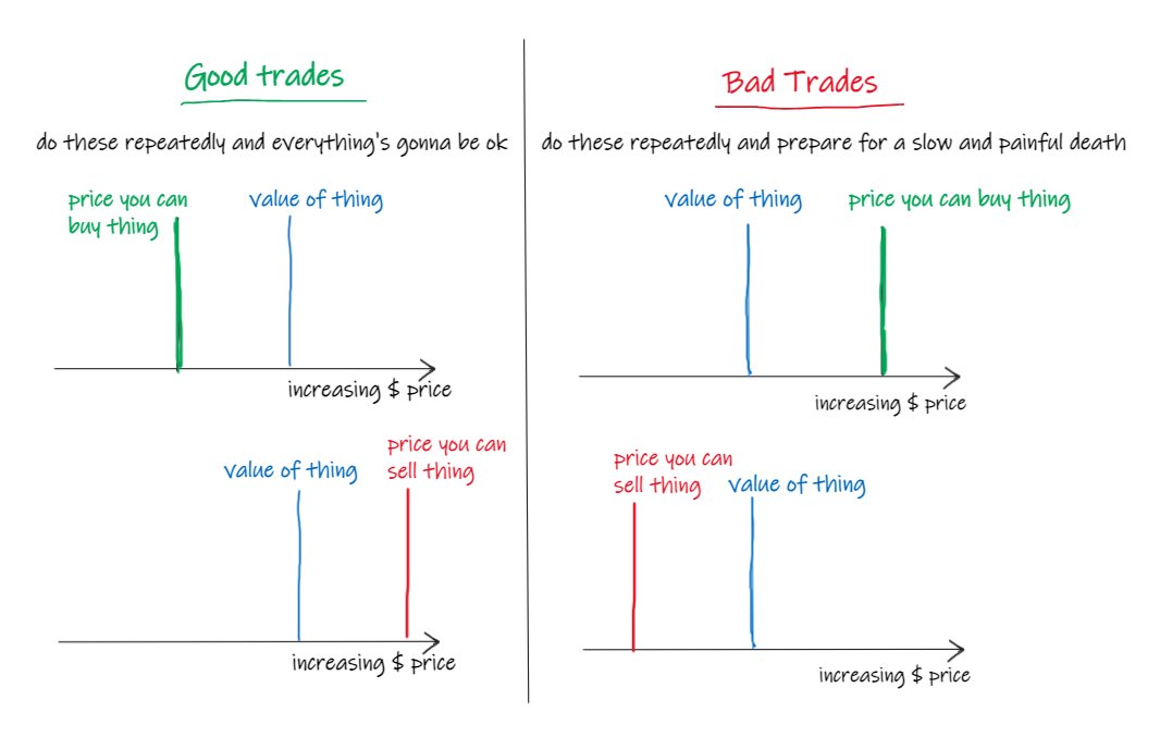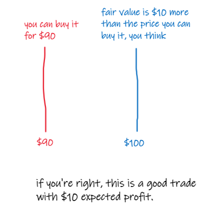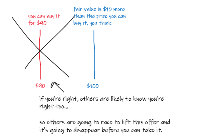 imagine an asset is offered at $90 but you think it's worth $100 - someone is willing to sell it at a $10 discount, you think. maybe you can buy it at a $10 then? but what is obvious to you is obvious to others too...