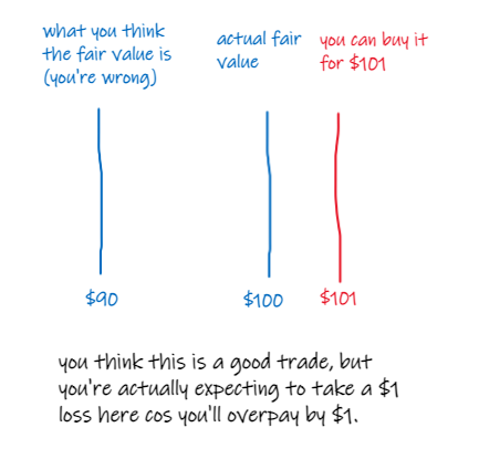 now, imagine that the same asset worth $100 is offered at $101 (something like this would be the normal situation) it's offered at $101 (slightly rich) - but you think it's worth $90. you think it's cheap. now you're wrong. that $91 offer isn't likely to go anywhere quick.