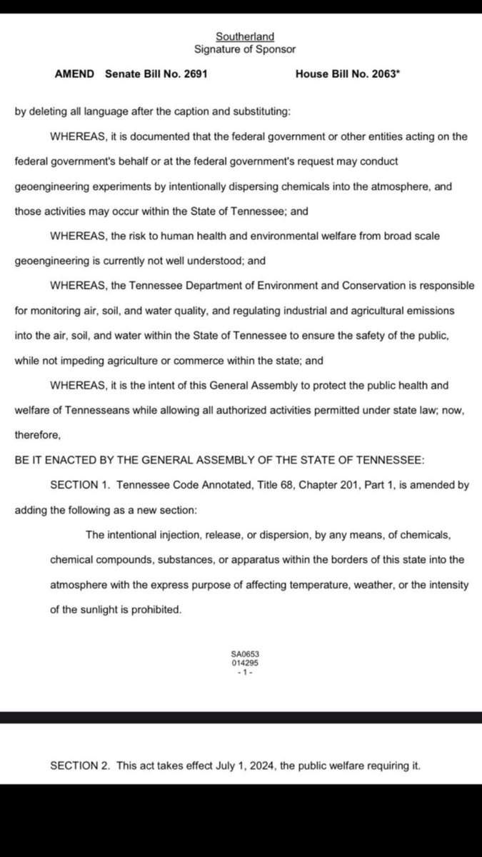 CHEMTRAIL BILL SB2 691/HB 2063 PASSED IN TENNESSEE But, but I thought Chemtrails were just contrails? The state Senate passed SB2 691/HB 2063 on Monday. It seeks to “prohibit the intentional injection, release, or dispersion, by any means, of chemicals, chemical compounds, substances, or apparatus within the borders of this state into the atmosphere with the express purpose of affecting temperature, weather, or the intensity of the sunlight.”