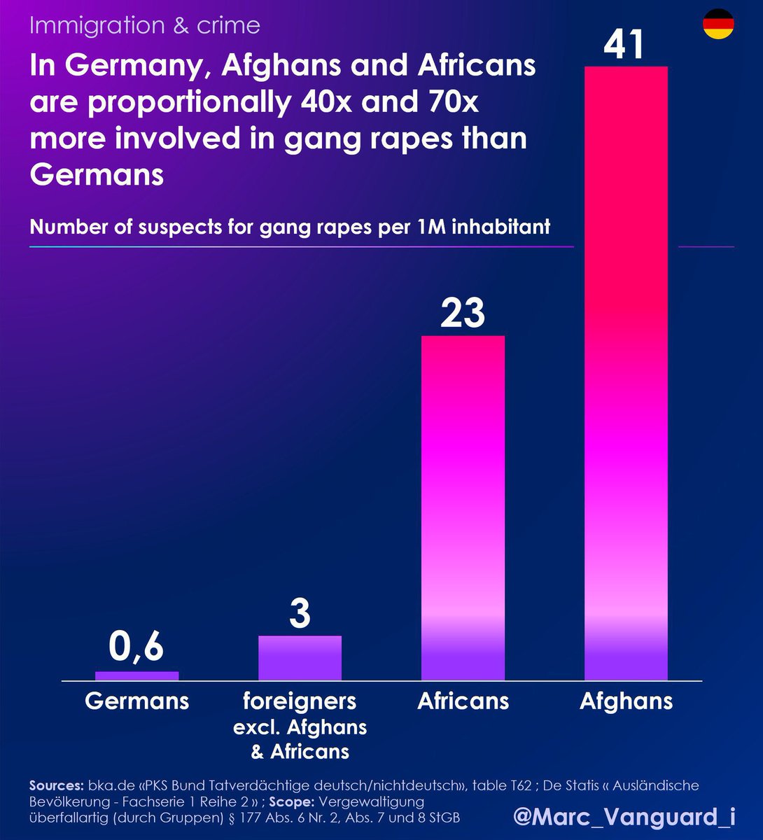 Take Germany, for example—the country with the largest share of refugees in Europe. Foreigners are just 12% of the German population. But they account for 67% of gang rape suspects. Afghans alone are 70 TIMES more likely to be involved in gang rapes than Germans. https://t.co/vYSHtPWVxQ