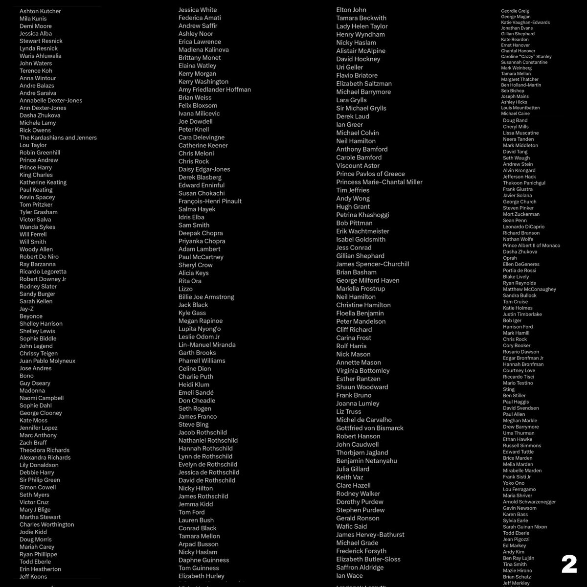 ▪️Linda Pinto ▪️Lisa Summers ▪️Lynn Forester de Rothchild ▪️Madonna ▪️Mandy Ellison (assistant) ▪️Mare Collins-Rector ▪️Marina Abramovic ▪️Mark Epstein ▪️Mark Lloyd ▪️Melinda Luntz ▪️Meryl Streep ▪️Michelle Obama ▪️Michelle Wolf ▪️Mikel Arteta ▪️Miley Cyrus ▪️Nadine Dorries ▪️Naomi Campbell ▪️Naomi Watts ▪️Natalie Blachon de Perrier ▪️Nicole Junkermann ▪️Olga Kurylenko ▪️Oliver Sacks ▪️Oprah ▪️Orlando Bloom ▪️Paris Hilton ▪️Patton Oswatt ▪️Paul Mellon ▪️Paula Epstein (deceased) ▪️Paula Hala ▪️Peter P. Marino ▪️Pharrell Williams ▪️Prince Andrew ▪️Prince Charles ▪️Quentin Tarantino ▪️Rachel Maddow ▪️Rainn Wilson ▪️Ralph Ellison ▪️Ray Barzana (pilot) ▪️Ricardo Legorreta Vilchis ▪️Rihanna ▪️Rita Wilson ▪️Rob Reiner ▪️Robert DeNiro ▪️Robert Downey Jr. ▪️Rodney E. Slater ▪️Ronald Burkle ▪️Rudy Gobert ▪️Sander Burger ▪️Sarah Kellen (assistant) ▪️Sarah Silverman ▪️Seth Green ▪️Shelley Harrison ▪️Shelley Lewis ▪️Sophie Biddle-Hakim ▪️Sophie Trudeau ▪️Stephen Collins ▪️Stephen Colbert ▪️Steven Spielberg ▪️Steven Tyler ▪️Svetlana Glazunova ▪️Teala Davies ▪️Tiffany Gramza ▪️Tom Hanks ▪️Tom Pritzker ▪️Tyler Grasham (deceased) ▪️Victor Salva ▪️Wanda Sykes ▪️Whoopi Goldberg