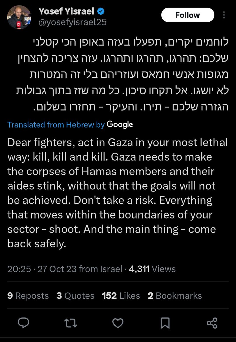 "Dear fighters, act in Gaza in your most lethal way: kill, kill and kill. Gaza needs to stink from corpses of Hamas and their aides, without that the goals will not be achieved. Don't take a risk. Everything that moves within the boundaries of your section - shoot." https://t.co/KaD7wCB1TO