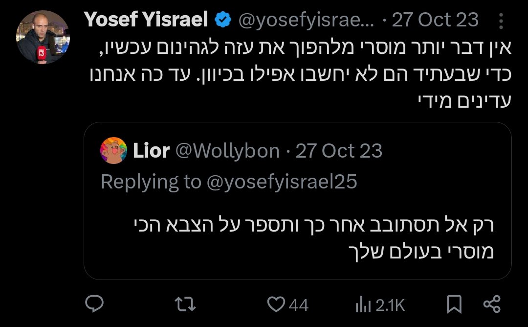 🧵 Wonder what Israeli "journalism" is like? short thread I have been sitting on for a while: On October 27th, due to the beginning of the invasion into Gaza, this liberal journalist posted the following: