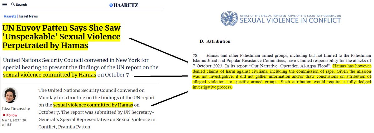 they're literally just inventing quotes now, and it's not just Haaretz, they did the same in the New York Times and elsewhere. They claimed Patten's report vindicates them when in reality it directly debunks their maximalist version of the "mass rape" hoax https://t.co/jUPzjDFB86