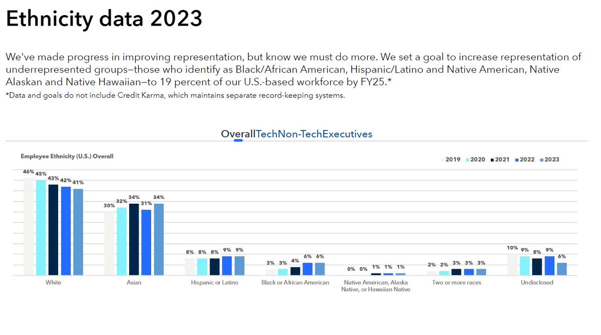 WHOA. In their DEI report, @Intuit company boasts that they've "made progress in improving representation" by hiring less white people. They're very proud that the percentage of white employees dropped every year. DEI is racist and is just code for less whites. https://t.co/FkA2LC5d5j