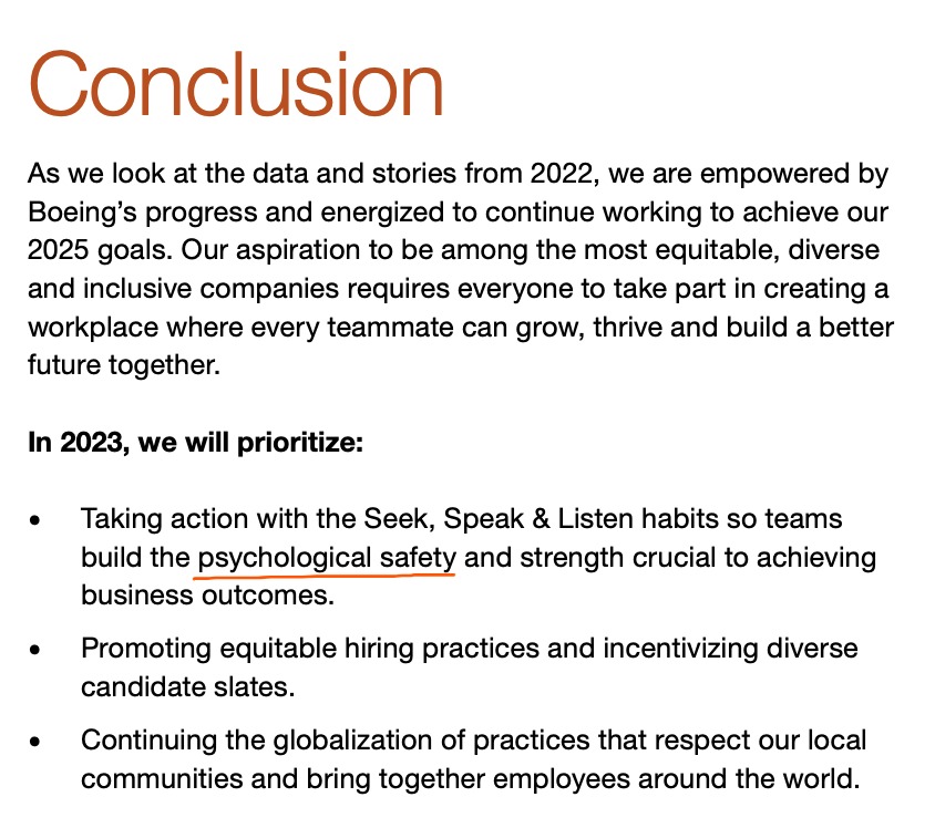 Further, when Boeing exes talk about safety in corporate documents, they often don't mean passenger safety but the "psychological safety" of employees, like in their DEI/GEDI report. These kinds of tricks are commonplace with that word. Read carefully. https://t.co/MH8tma3lSj