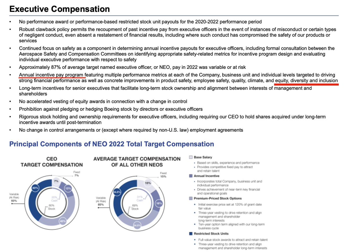 Up to 40% of the executives' potential pay is in that "annual incentive pay program" which is tied to hitting DEI targets. For those just catching on, DEI doesn't have anything to do with aircraft manufacturing or safety.