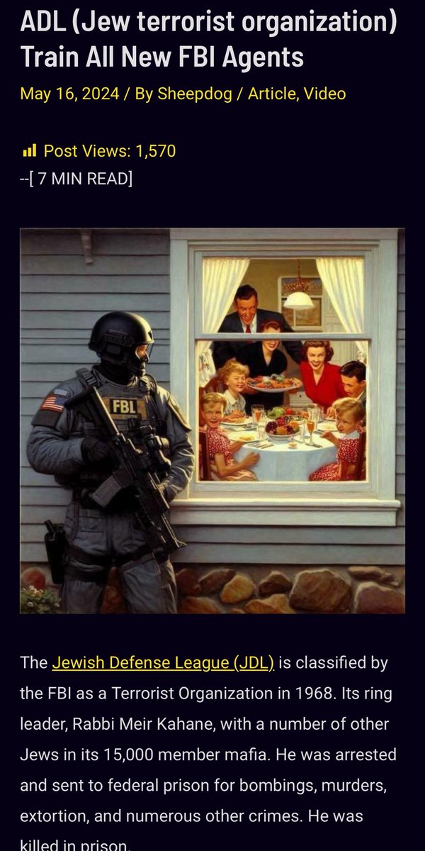 RECALL how the ADL trains All New FBI Agents! ADL: they educate annually an estimated 15,000 law enforcement personnel from local, state and federal agencies! The ADL writes and applies the definitions of notions such as extremism, they wish government to enforce. They take care to ensure that it predominantly captures those opposed to their ideology, while excusing their political allies.